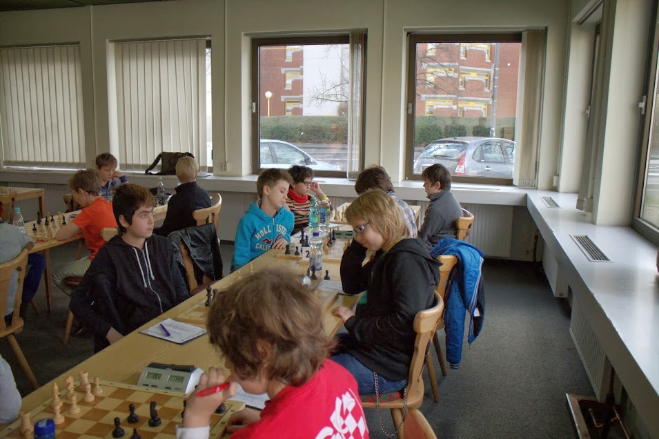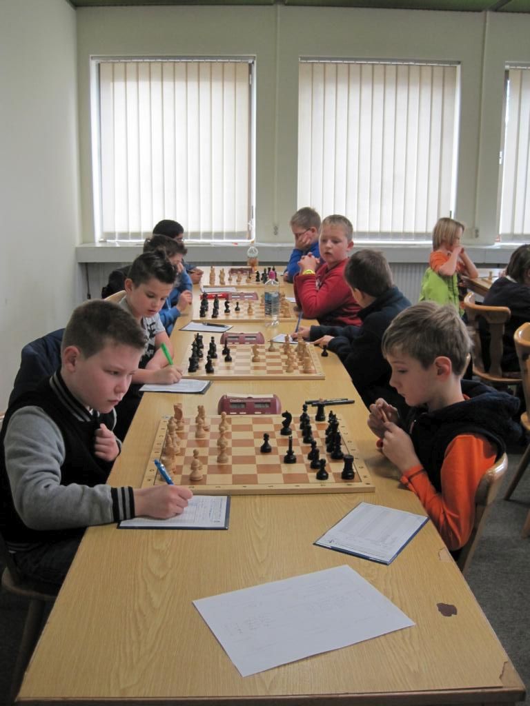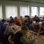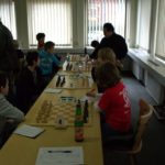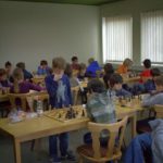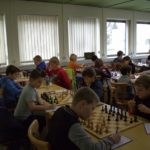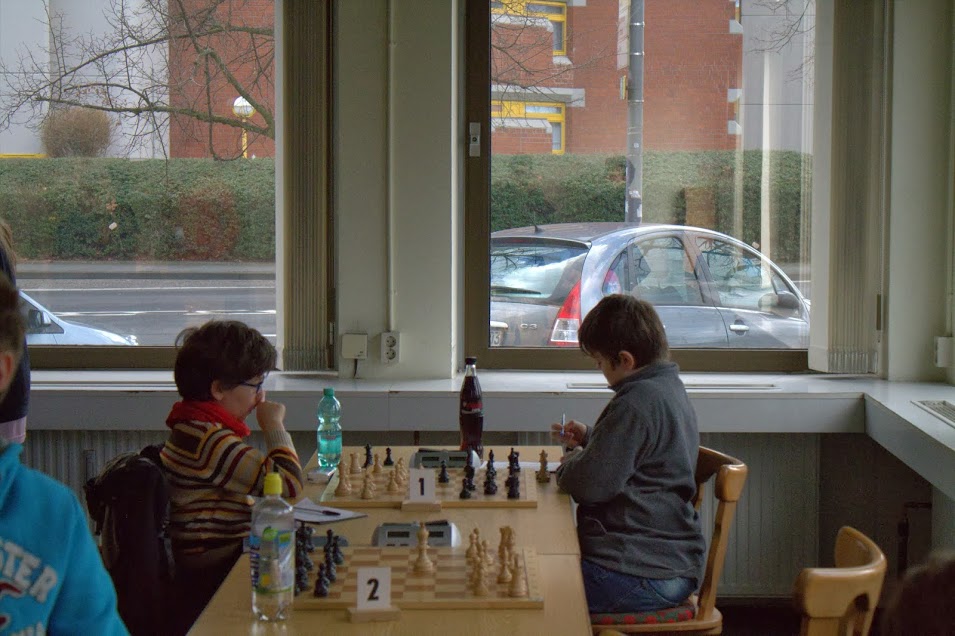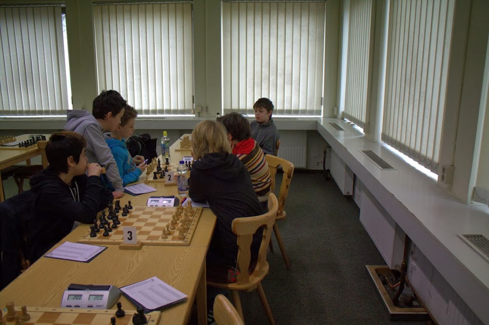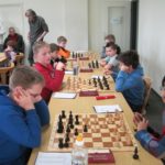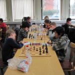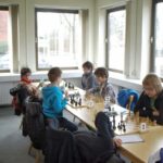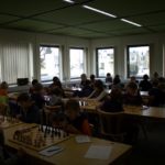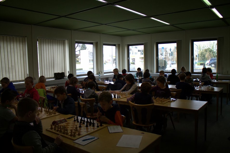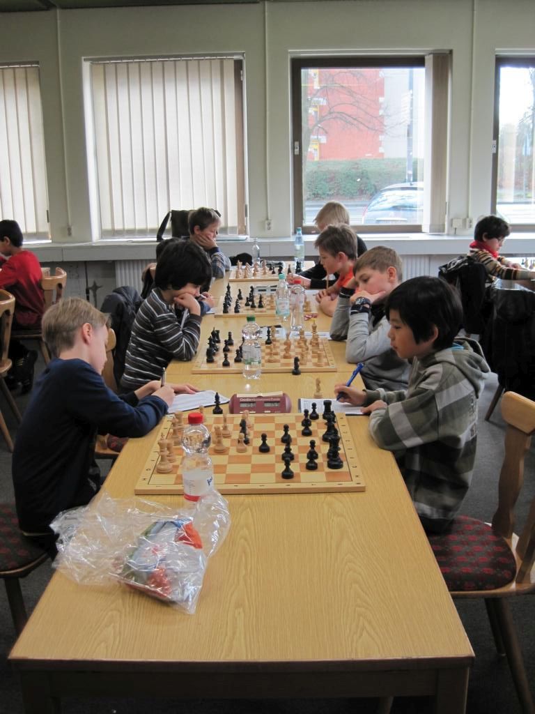 Nur einen Tag nach der letzten Runde der Kölner Jugend-Einzelmeisterschaft (also am 16.02.) war unser Spiellokal erneut fast bis auf den letzten Sitzplatz besetzt. Insgesamt nicht weniger als zehn(!) Mannschaften kämpften um Brett- und Mannschaftspunkte. Zum Glück waren nur zwei davon 8er-Mannschaften. Der Rest waren unsere vier U12-Mannschaften und ihre jeweiligen Gegner. Da diese sich ja an jeweils ’nur‘ vier Brettern gegenüber saßen, konnten wir diese vier Mannschaftskämpfe gut in unserem größten Raum unterbringen. Damit spielte in diesem Raum mehr als die Hälfte der gesamten U12-Mannschaftsmeisterschaft der Kölner Schachjugend!