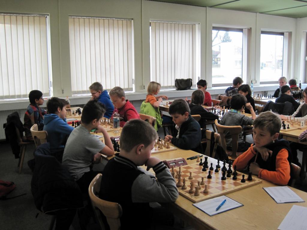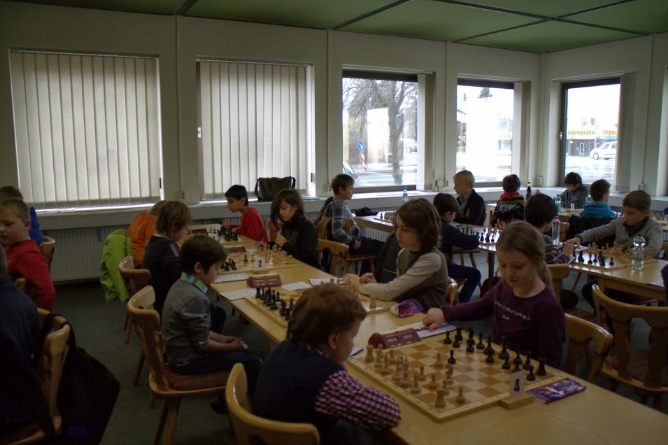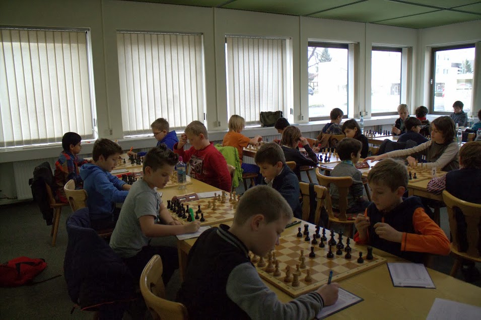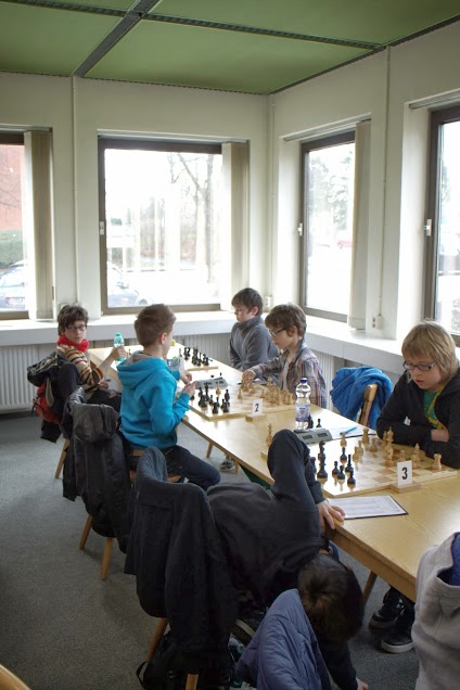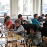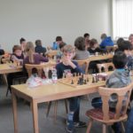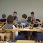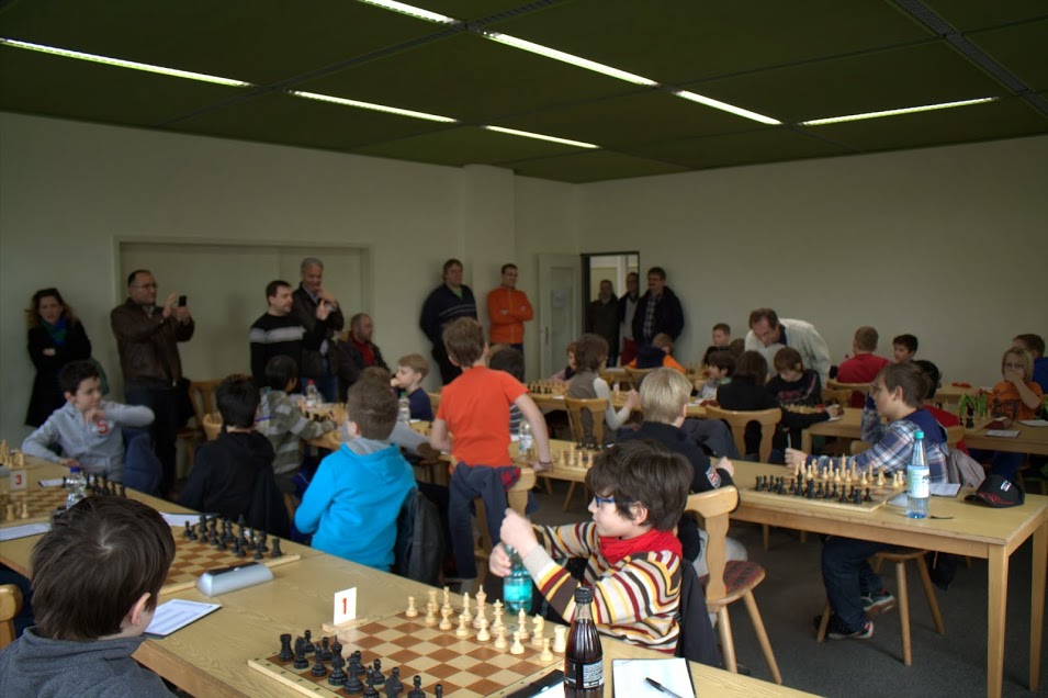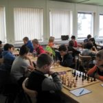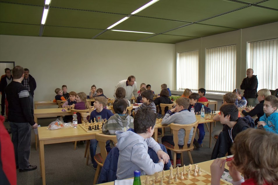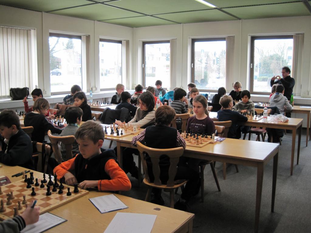 Nur einen Tag nach der letzten Runde der Kölner Jugend-Einzelmeisterschaft (also am 16.02.) war unser Spiellokal erneut fast bis auf den letzten Sitzplatz besetzt. Insgesamt nicht weniger als zehn(!) Mannschaften kämpften um Brett- und Mannschaftspunkte. Zum Glück waren nur zwei davon 8er-Mannschaften. Der Rest waren unsere vier U12-Mannschaften und ihre jeweiligen Gegner. Da diese sich ja an jeweils ’nur‘ vier Brettern gegenüber saßen, konnten wir diese vier Mannschaftskämpfe gut in unserem größten Raum unterbringen. Damit spielte in diesem Raum mehr als die Hälfte der gesamten U12-Mannschaftsmeisterschaft der Kölner Schachjugend!