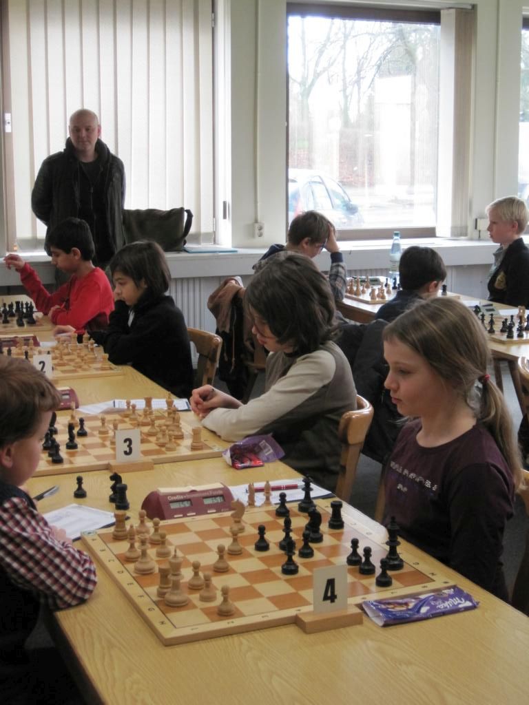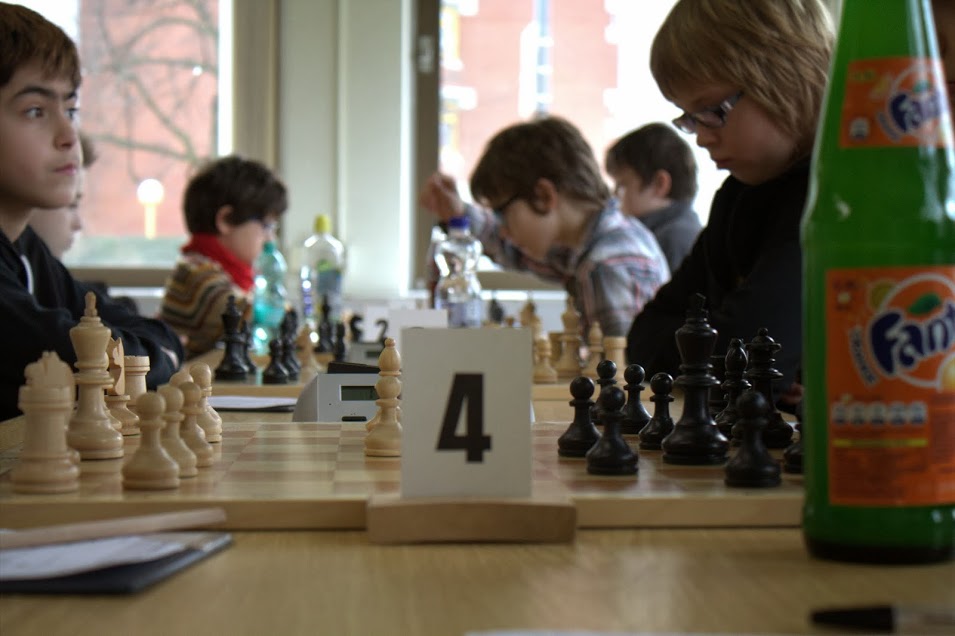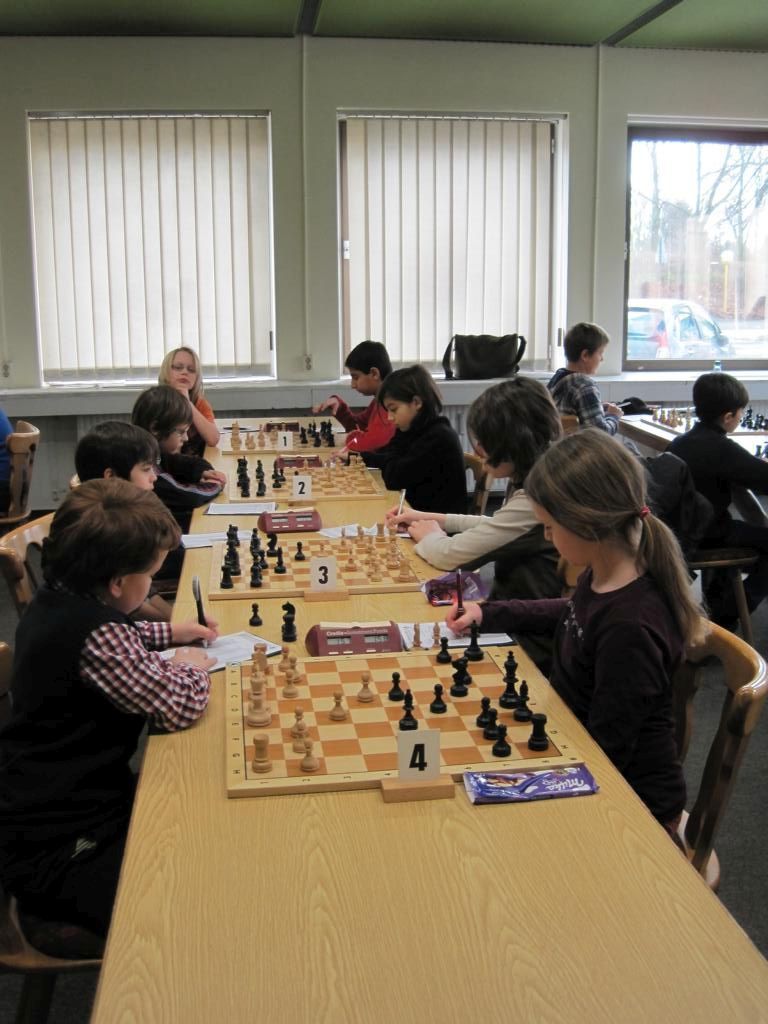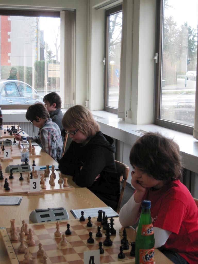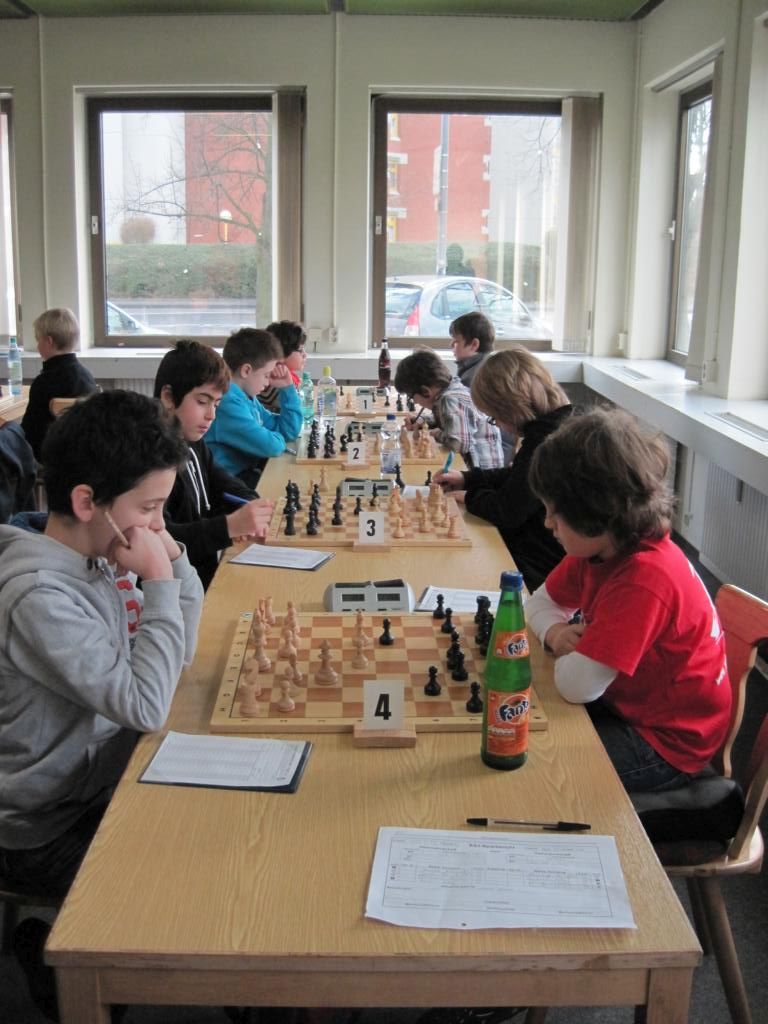 Zur vierten Runde in der Gruppe Ost empfing unsere erste Mannschaft einen ihrer beiden größten Konkurrenten um den Einzug ins Finale der beiden Gruppensieger. Durch eine konzentrierte Leistung konnte man am Ende aber einen relativ ungefährdeten 4:0-Erfolg gegen die Mannschaft aus Köln-Mülheim erzielen. Dadurch ist nun die U12 des Klubs Kölner Schachfreunde (KKS) der schärfste Konkurrent. Gegen ebendiese Mannschaft spielte sozusagen ’nebenan‘ unsere dritte Mannschaft. Gegen die favorisierten KKSler gab es zwar eine Menge Gegenwehr, doch am Ende blieb leider nichts Zählbares für unsere Mannschaft übrig. Ein Trost für unsere dritte ist, dass sie nun die stärksten Gegner hinter sich hat, so dass in den nächsten Runden der eine oder andere Mannschaftspunkt noch möglich sein sollte.