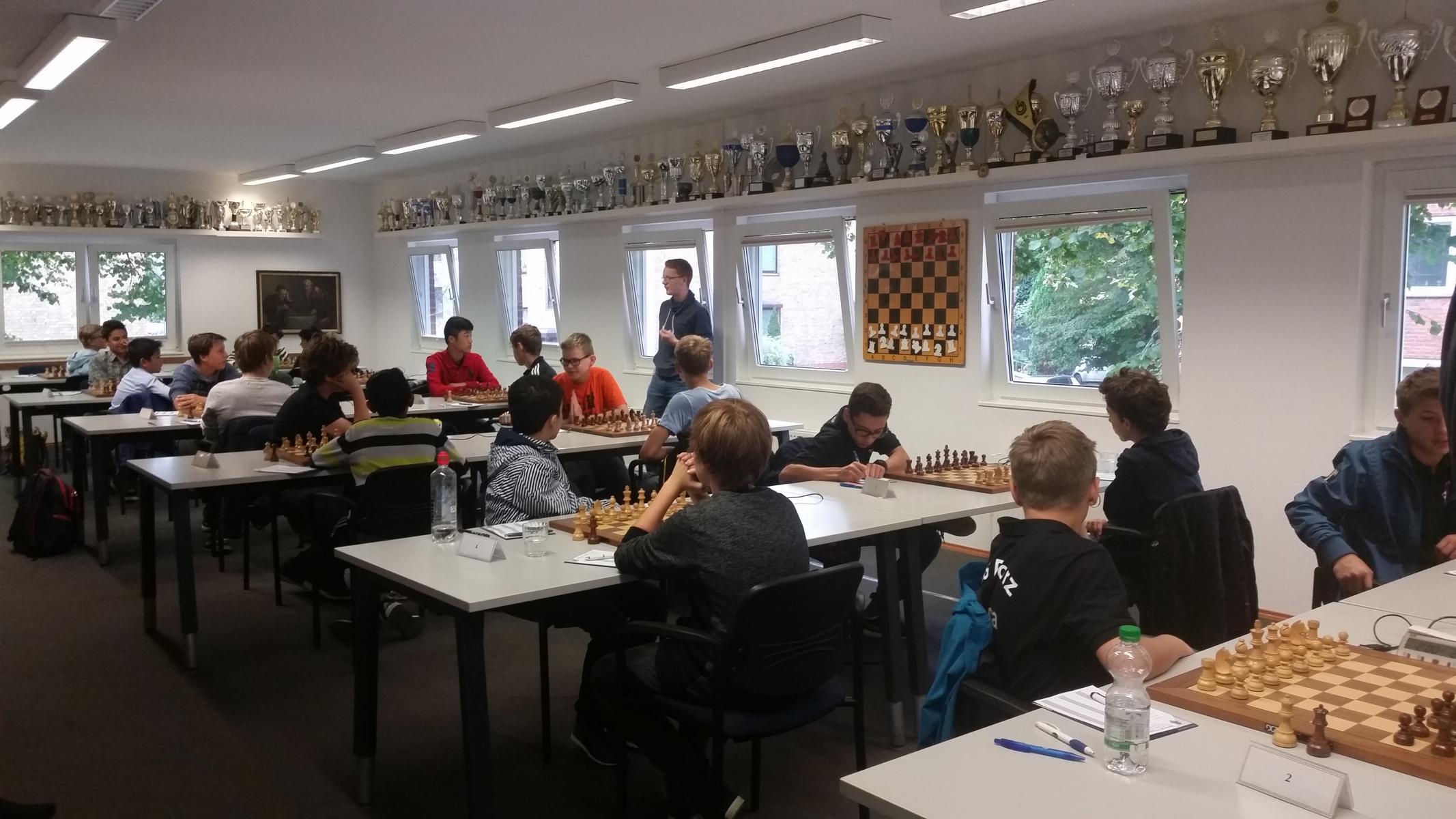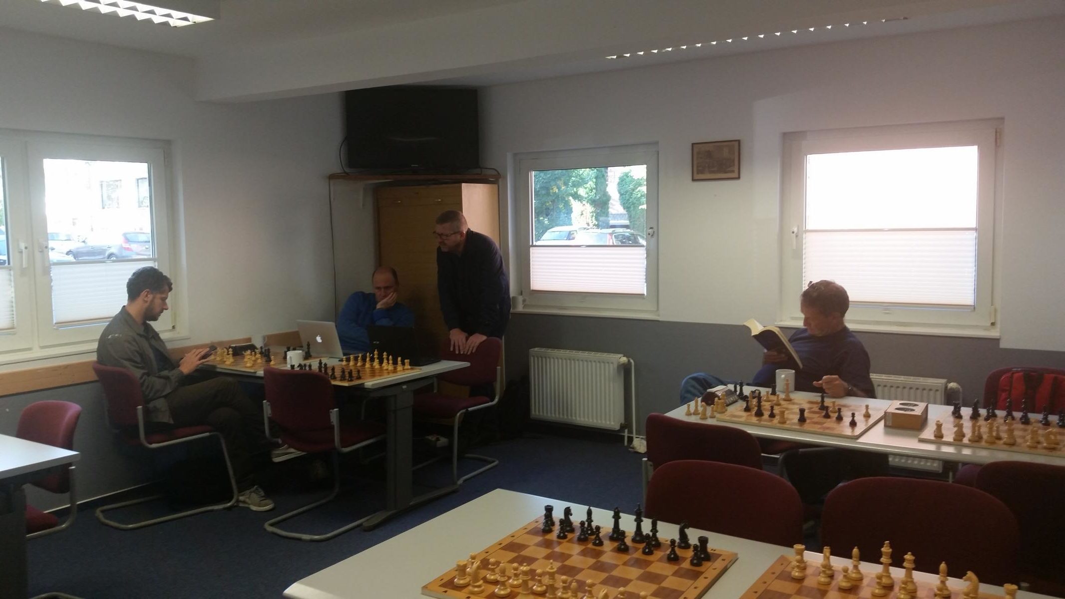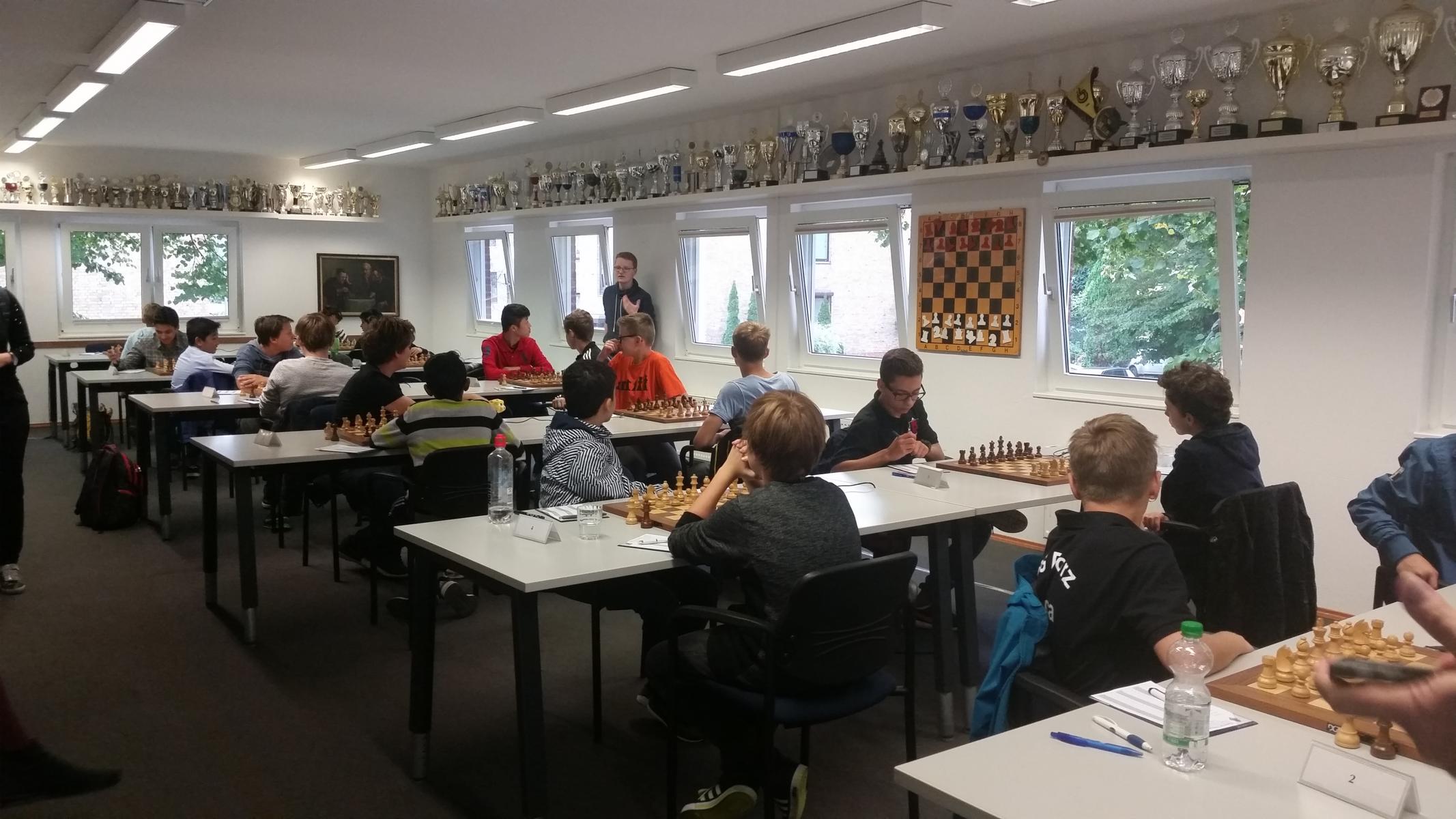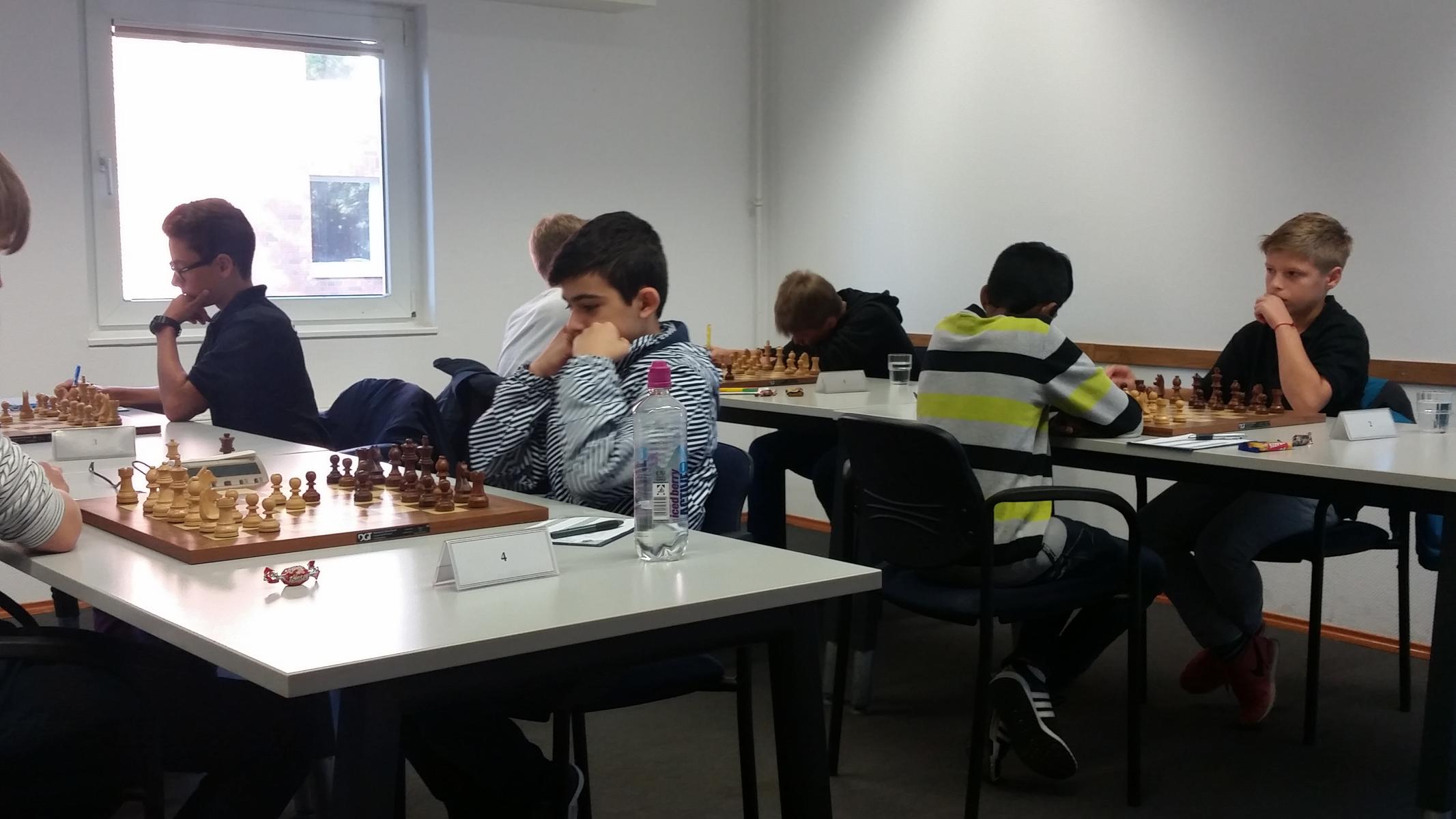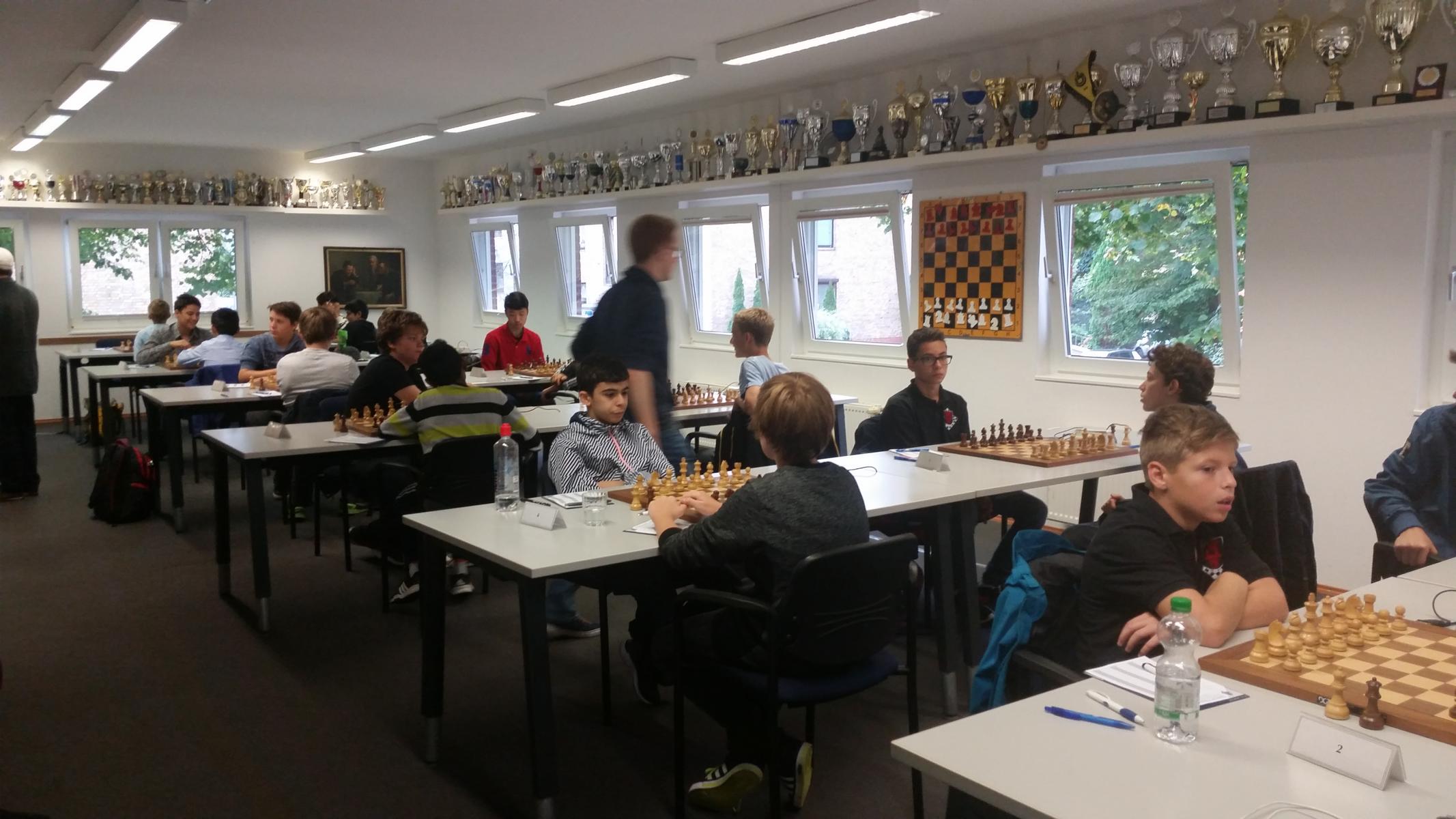 In der 1. Runde wurden wir gegen das Team aus Wien gepaart. Unsere Spieler nahmen im Spielsaal im Obergeschoss an den DGT-Brettern Platz, die eine Liveübertragung ins Internet und in das Erdgeschoss des Klubheims ermöglichten – ein toller Service für die Eltern/Trainer daheim und für die Betreuer vor Ort. Nach einer kurzen Begrüßung durch Organisator Daniel Grötzbach und den HSK-Vorsitzenden Christian Zickelbein ging es dann auch auf den 64 Feldern zur Sache. An allen Brettern waren wir mehr oder weniger deutlicher ELO-Favorit und der Kampf nahm seinen erhofften Verlauf. Relativ ungefährdet wurde ein Punkt nach dem anderen geerntet und am Ende stand ein 4:0-Auftaktsieg für uns zu Buche. Am Nebentisch gab es jedoch eine dicke Überraschung – die dänische Auswahl besiegte die zwar nicht in Bestbesetzung angetretene, aber trotzdem noch immer nominell stärkere Mannschaft des HSK mit 2,5-1,5.