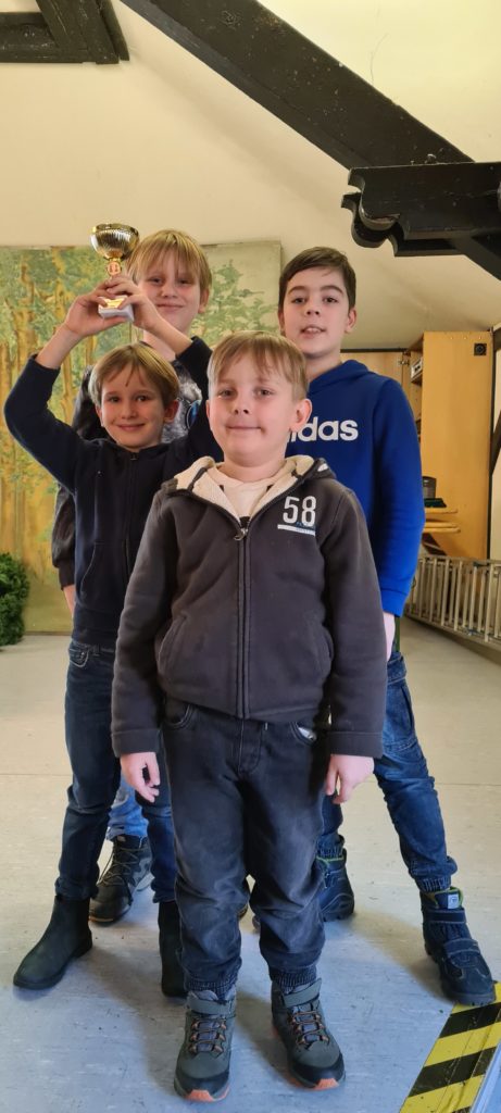 Da der Schachjugend Mittelrhein vier Qualifikationsplätze zustehen, war bereits vor Turnierbeginn klar, dass alle drei teilnehmenden Vereine (Fritzdorf, Brühl und Porz) mit ihren ersten Mannschaften qualifiziert waren und die besser platzierte zweite Mannschaft von Fritzdorf oder von Porz ebenfalls einen Qualifikationsplatz erhalten würde. Von Beginn an setzten sich Fritzdorf 1 und Porz 1 vom restlichen Feld ab und Fritzdorf gewann das direkte Duell und damit auch die Meisterschaft. Doch hinter diesen beiden Teams entbrannte ein heftiger Kampf zwischen Fritzdorf 2 und Porz 2 um den dritten Platz, der ja durch die automatische Qualifikation von Brühl 1 den vierten und letzten Qualifikationsplatz darstellte. Die Auslosung war so, dass das entscheidende Duell zwischen diesen beiden Mannschaften in der letzten Runde stattfand. In einem nervenaufreibenden Finale konnte sich unsere zweite Mannschaft ganz knapp durchsetzen. Damit fahren tatsächlich zwei Porzer U12-Teams zur entsprechenden NRW-Meisterschaft, die am 06.05. voraussichtlich in Dortmund stattfinden wird.