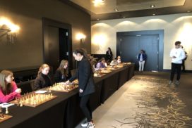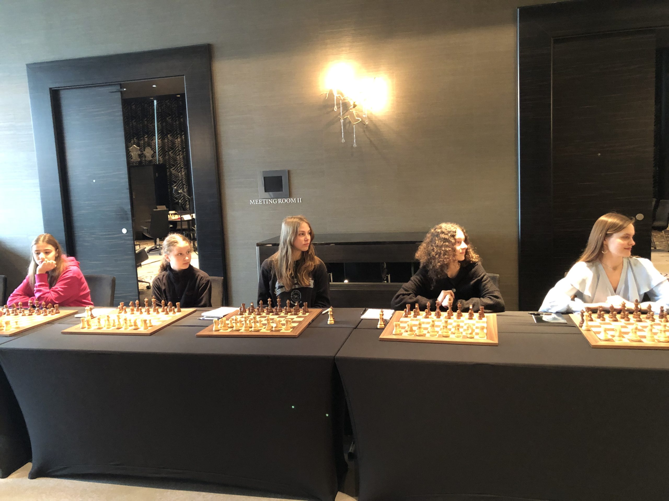 Neben diesem Superturnier gibt es aber auch eine Vielzahl von interessanten Side Events. So bekamen heute zehn Mädchen aus der Region die Gelegenheit, im Simultan gegen die dreifache Jugend- und Junioren-Weltmeisterin GM Zhansaya Abdumalik anzutreten. Mit Michelle, Greta und Clara waren gleich 3 Mädchen von der SG Porz mit von der Partie. Würde es einem Mädchen vielleicht gelingen, der favorisierten Großmeisterin ein Remis abzutrotzen? Auch wenn der Elo-Unterschied bei 500+ liegt: Ähnlich wie beim DFB-Pokal hat Simultanschach ja bekanntlich seine eigenen Gesetze. Einige Partien waren recht schnell vorbei, bei anderen dauerte es zumindest etwas länger. Letztlich setzte sich GM Zhansaya Abdumalik aber doch ziemlich souverän gegen alle 10 Mädchen durch. Bei einigen Stellungen musste sie jedoch tatsächlich länger als 5 Sekunden nachdenken, was man ja vielleicht auch schon als kleinen Erfolg werten kann. 😉