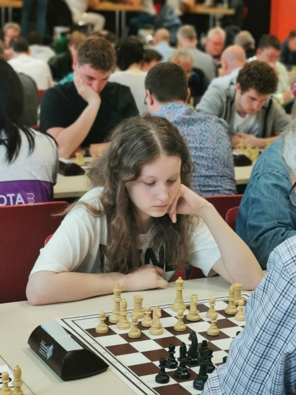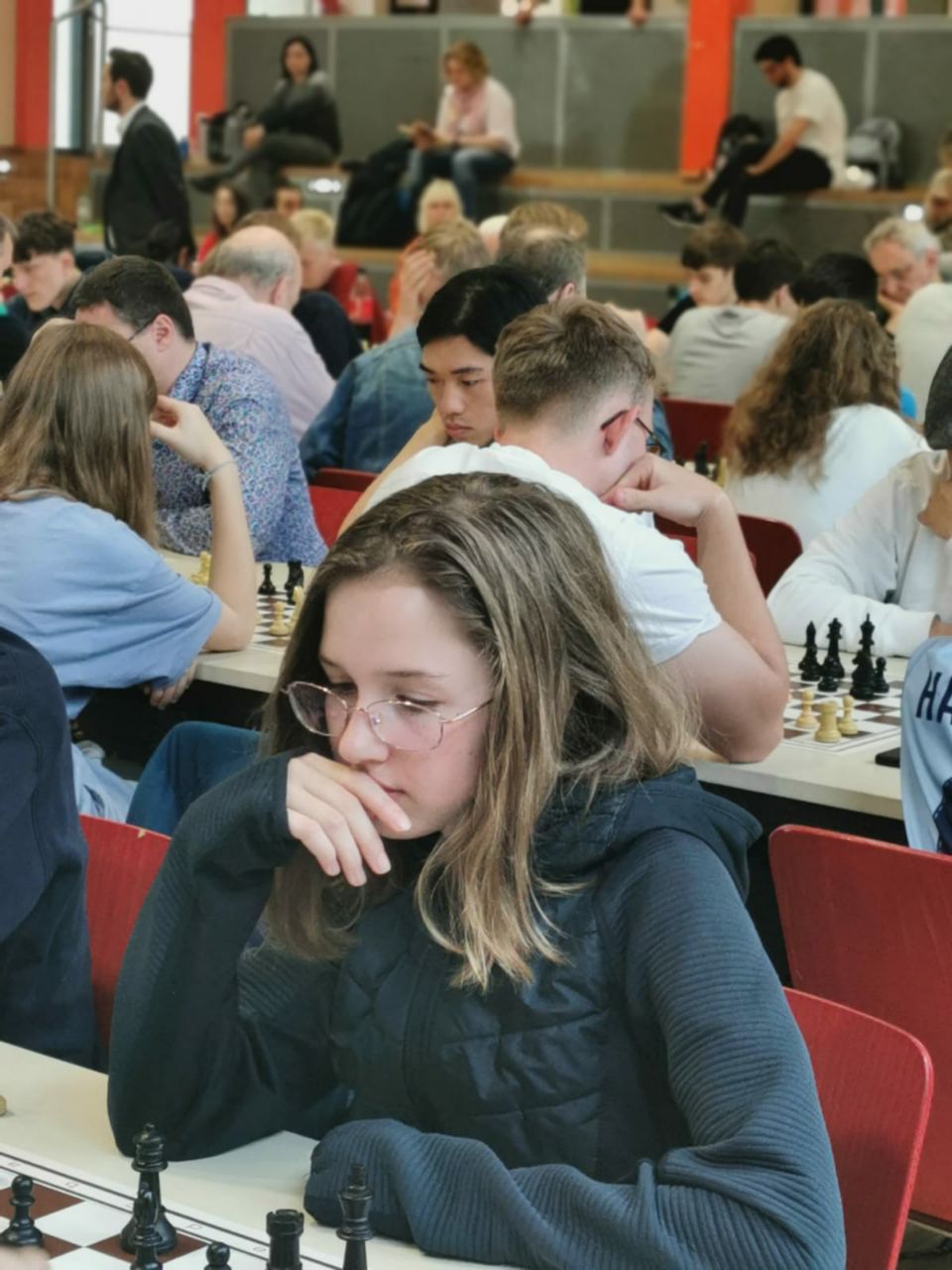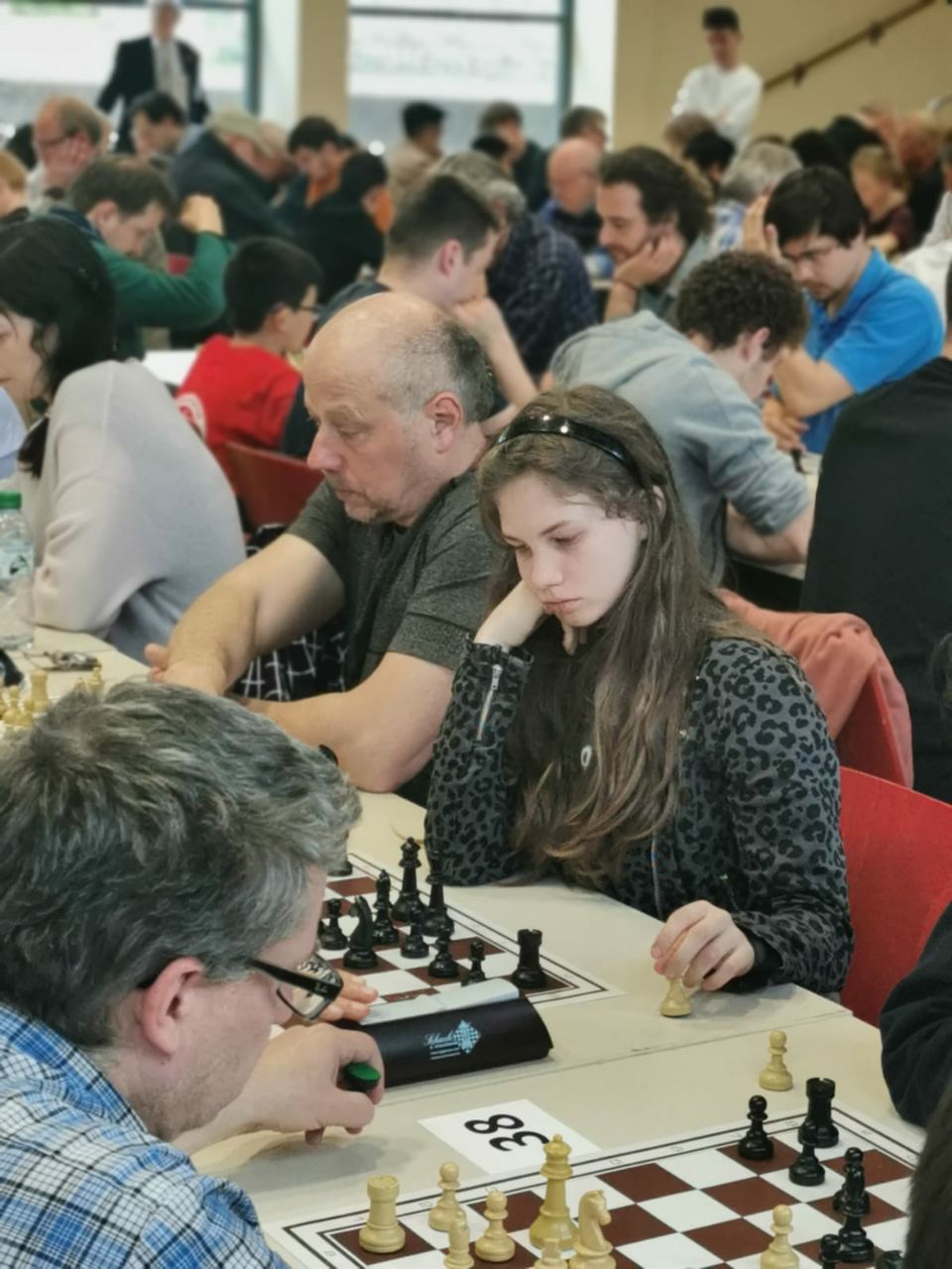 Am vorletzten Sonntag (07.05.) konnte die SG Porz nach dreijähriger Corona-Pause endlich wieder ein großes Schnellschach-Turnier ausrichten. Bedingt durch den Nachholbedarf aufgrund der langen Pause und durch den allgemeinen Boom, den das Schach in dieser Pause erlebt hat, vermuteten wir, dass das Interesse an einem solchen Turnier doch etwas größer ausfallen könnte als vor der Pause. Daher hatten wir uns auf die Suche nach einem Austragungsort gemacht, der mehr Spielern Platz bot als unser eigenes Spiellokal. Nach einigen Telefonaten und Emails stießen wir dabei auf die Aula des Stadtgymnasiums Porz. Wie sich herausstellen sollte, war dies aus mehreren Gründen ein Glücksgriff, doch dazu später mehr. Nach einer ersten Besichtigung und einer etwas oberflächlichen Zählung der vorhandenen Tische und Stühle, veröffentlichten wir die Ausschreibung mit einer Maximal-Teilnehmerzahl von 190. Dies in der etwas naiven (und irrigen) Annahme, dass diese Teilnehmerzahl ja sowieso nicht erreicht werden würde …