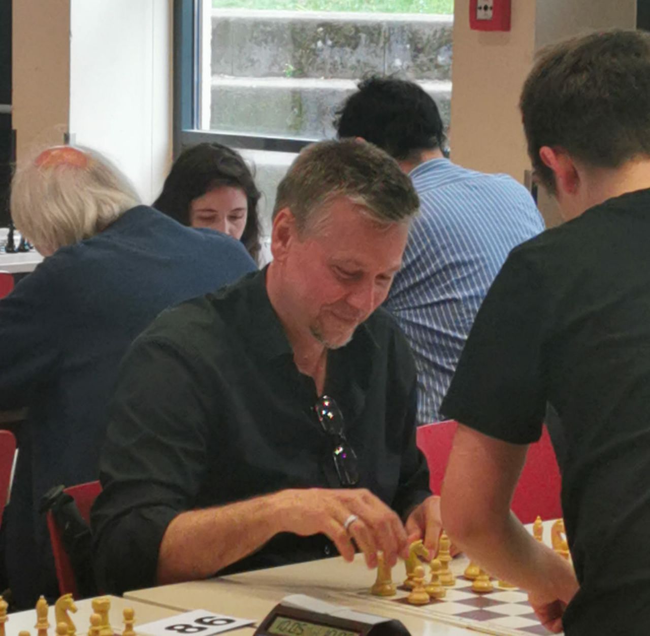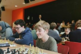 Es entwickelte sich ein Turnier in äußerst angenehmer Atmosphäre ohne größere Zwischen- oder gar Streitfälle. Die detaillierten Ergebnisse kann man am besten auf der Seite von Chess-Results nachvollziehen; der Link dorthin befindet sich weiter unten unter ‚Ergebnisse‘. Der Turniersaal wurde von vielen Teilnehmern gelobt. Es fiel vor allem auf, dass die Luft darin auch in der letzten Runde noch richtig frisch war; das hat man bei anderen Schnellschach-Turnieren schon ganz anders erlebt. Dies war sicherlich auch ein Verdienst des überaus hilfsbereiten Hausmeisters, der schon zu Turnierbeginn für eine sinnvolle Durchlüftung gesorgt hatte. Überhaupt der Hausmeister: Als ich am Turniertag um kurz nach 08:00 Uhr ankam, lief bereits der erste Kaffee. Und als später am Tag einmal der Durchlauferhitzer der Spüle kein warmes Wasser mehr produzierte, war der Hausmeister umgehend zur Stelle und sorgte dafür, dass er wieder funktionierte. So macht eine Turnier-Ausrichtung natürlich Spaß. Daher an dieser Stelle ein herzliches Dankeschön an den Hausmeister des Stadtgymnasiums, aber auch an die Stadt Köln, die uns diesen hervorragenden Spielort zu annehmbaren Miet-Konditionen zur Verfügung gestellt hat.