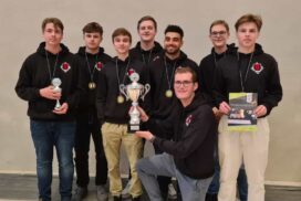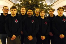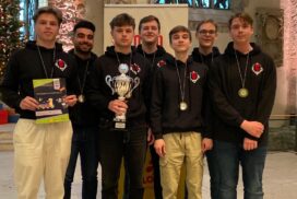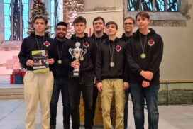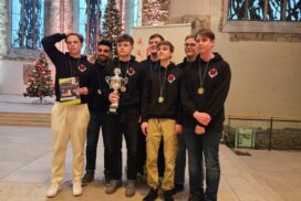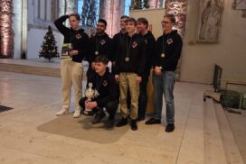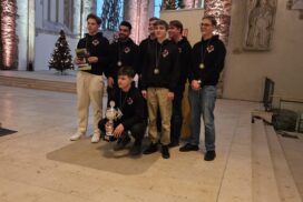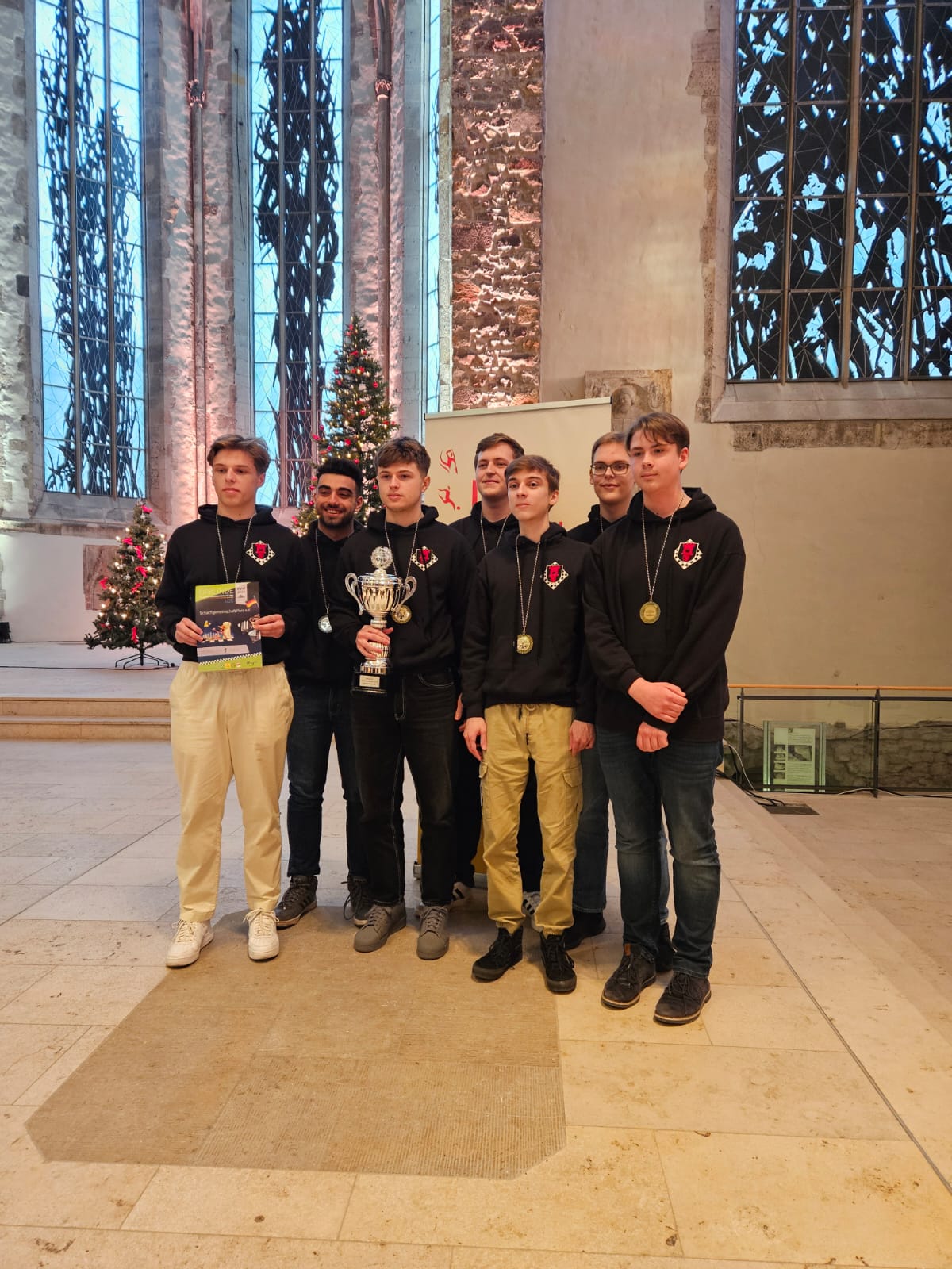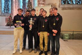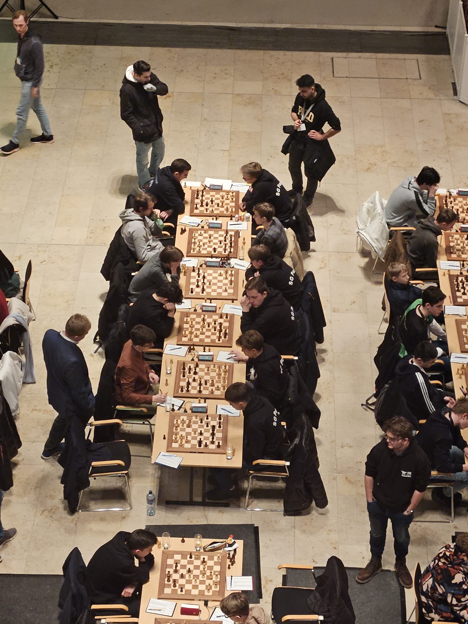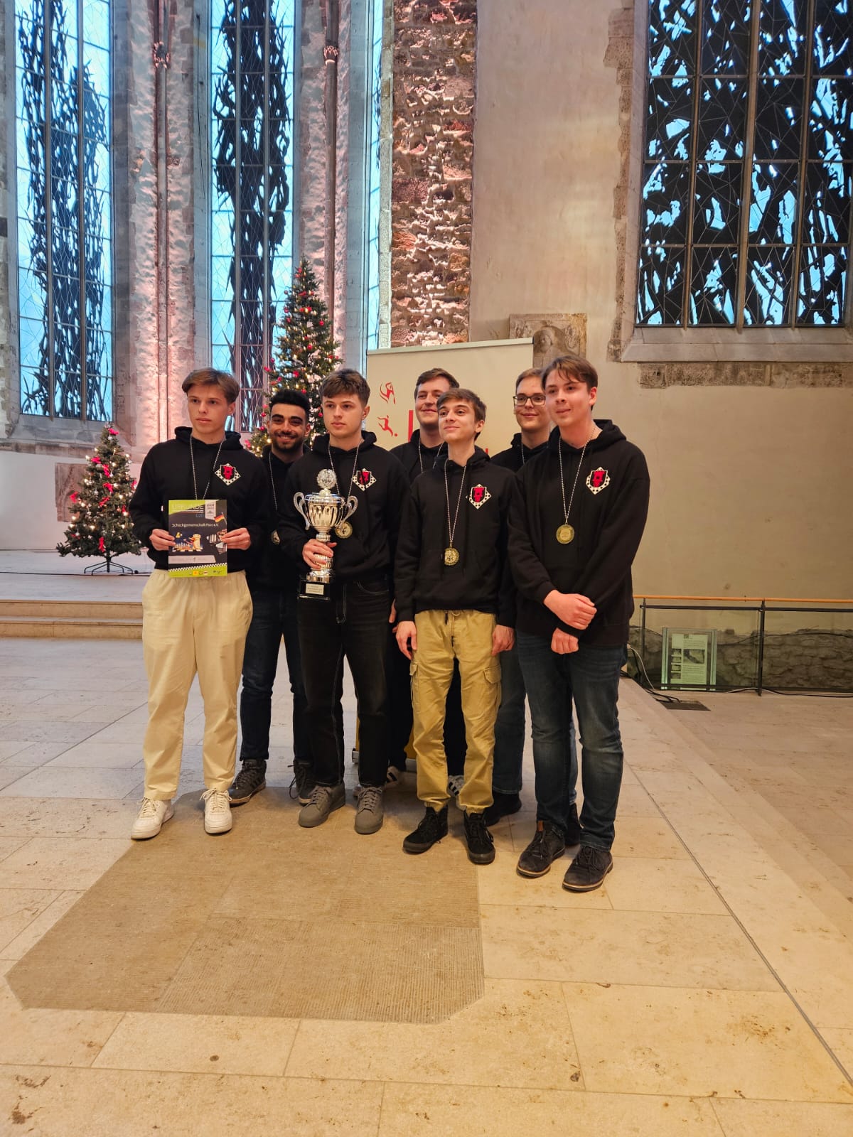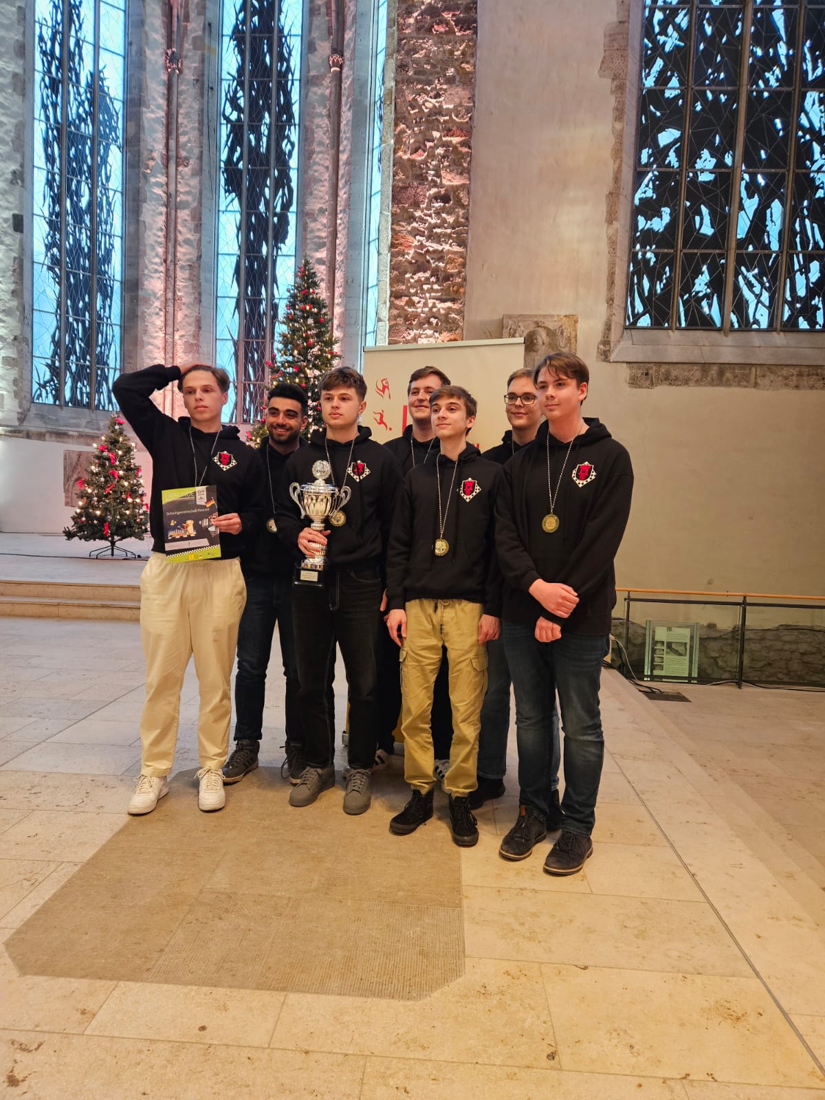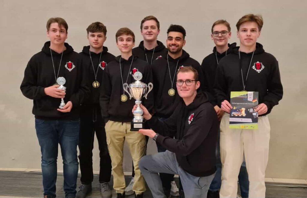 Der entscheidende Mannschaftskampf entwickelt sich schnell. Alex am Spitzenbrett trennt sich von seinem nominell gleichwertigen Gegner innerhalb weniger als einer Stunde remis. Christian zeigt sich aber wieder blendend vorbereitet und nimmt seinem Gegner nach einer Ungenauigkeit taktisch einen Bauern ab, den er zügig und sauber verwertet. Christian ist damit der Topscorer des Teams und holt 5,5 Punkte aus 7 Partien, was ihm auch noch den Brettpreis am 4. Brett beschert! Sein Sieg beruhigt die Nerven entscheidend, da Borna und Rafael sich klare Vorteile erarbeitet haben. Jonas, der insgesamt ein für seine Ansprüche eher durchwachsenes Turnier spielt, nimmt aus seiner Partie auch die Luft raus und bietet mannschaftsdienlich remis. Beim Stand von 2-1 und herannahender Zeitnot verbessern sich die Stellungen von Borna und Rafael kontinuierlich und das gesamte Team sehnt den letzten noch fehlenden Brettpunkt herbei. Um 11:47 Uhr ist endlich soweit – Bornas Gegner resigniert im Läufer gegen Springerendspiel und wir sind DEUTSCHER MEISTER! Wenig später macht Rafael auch das perfekte Turnier amtlich und besiegelt mit seinem Sieg zum 4:1 unseren 7. Sieg im 7. Spiel. Lucas abschließendes Remis zum 4,5:1,5 ist dann nur noch für die Statistikfreunde von Interesse.