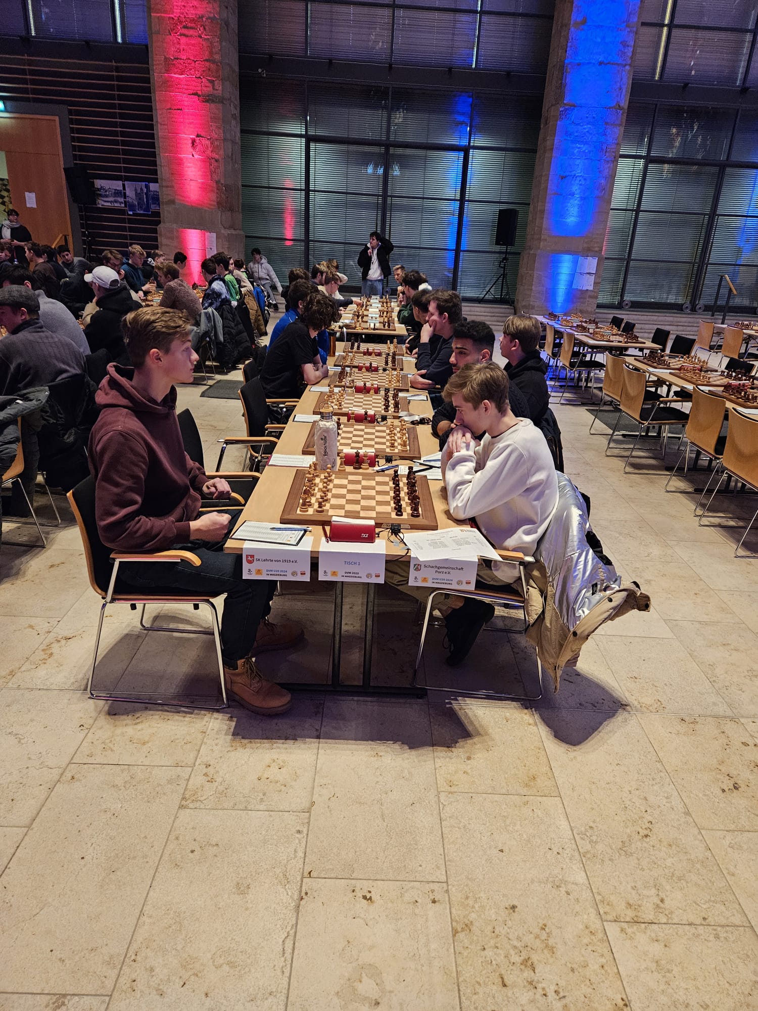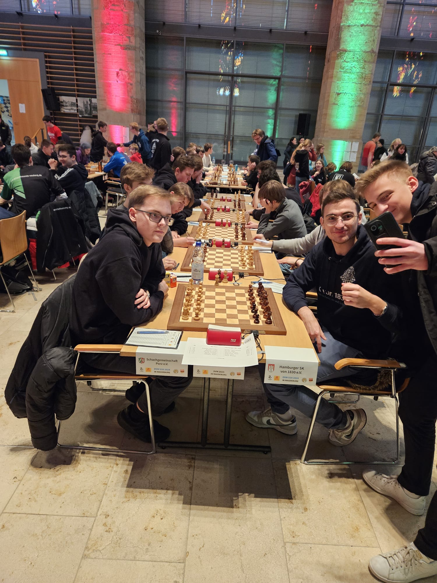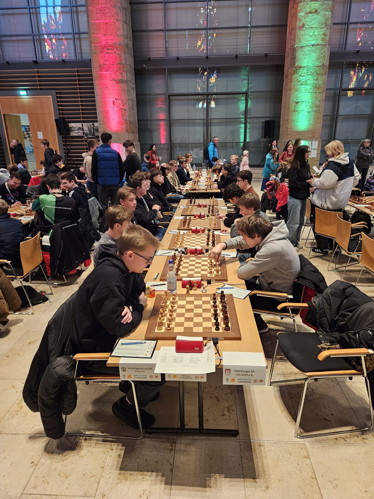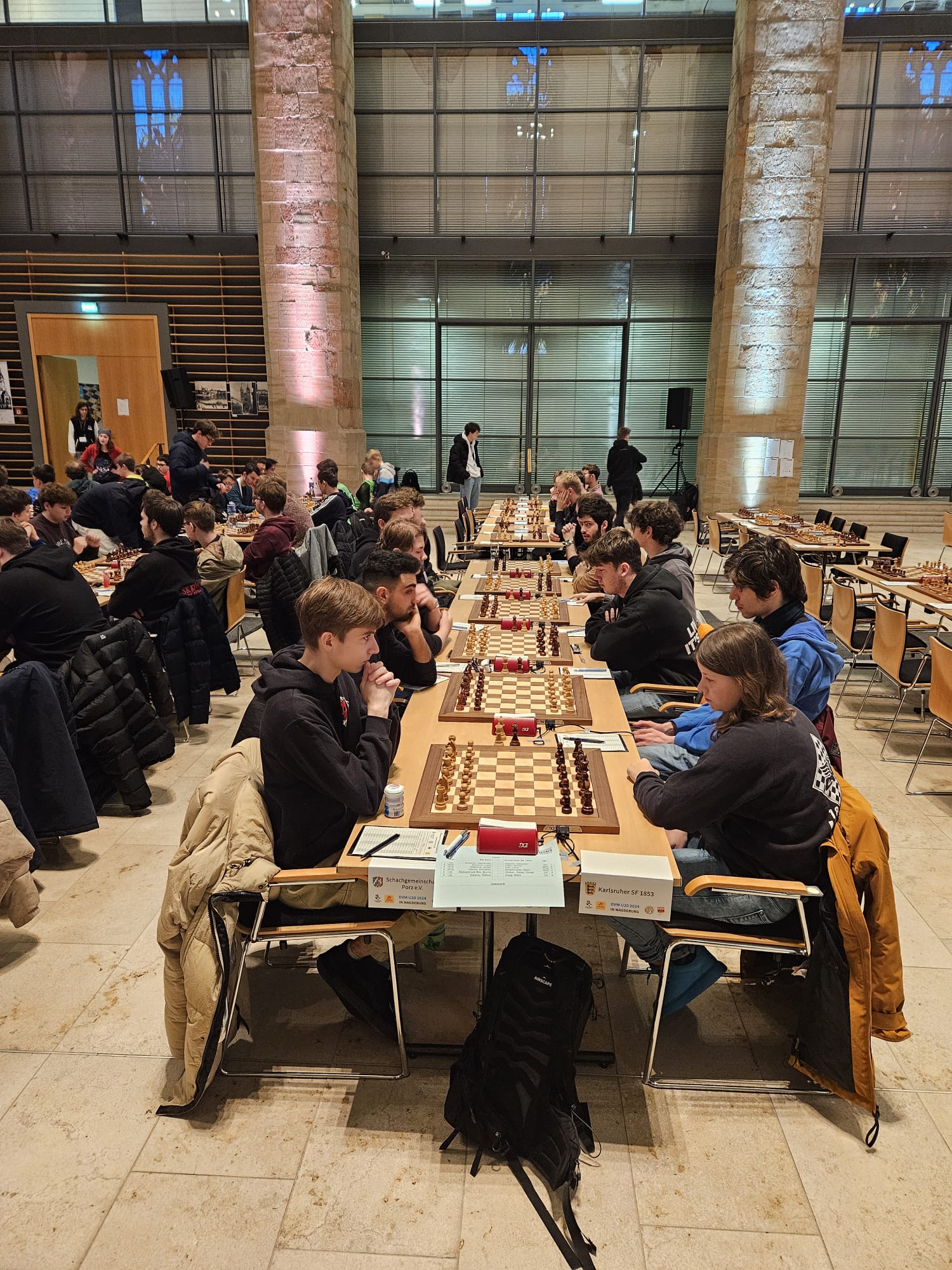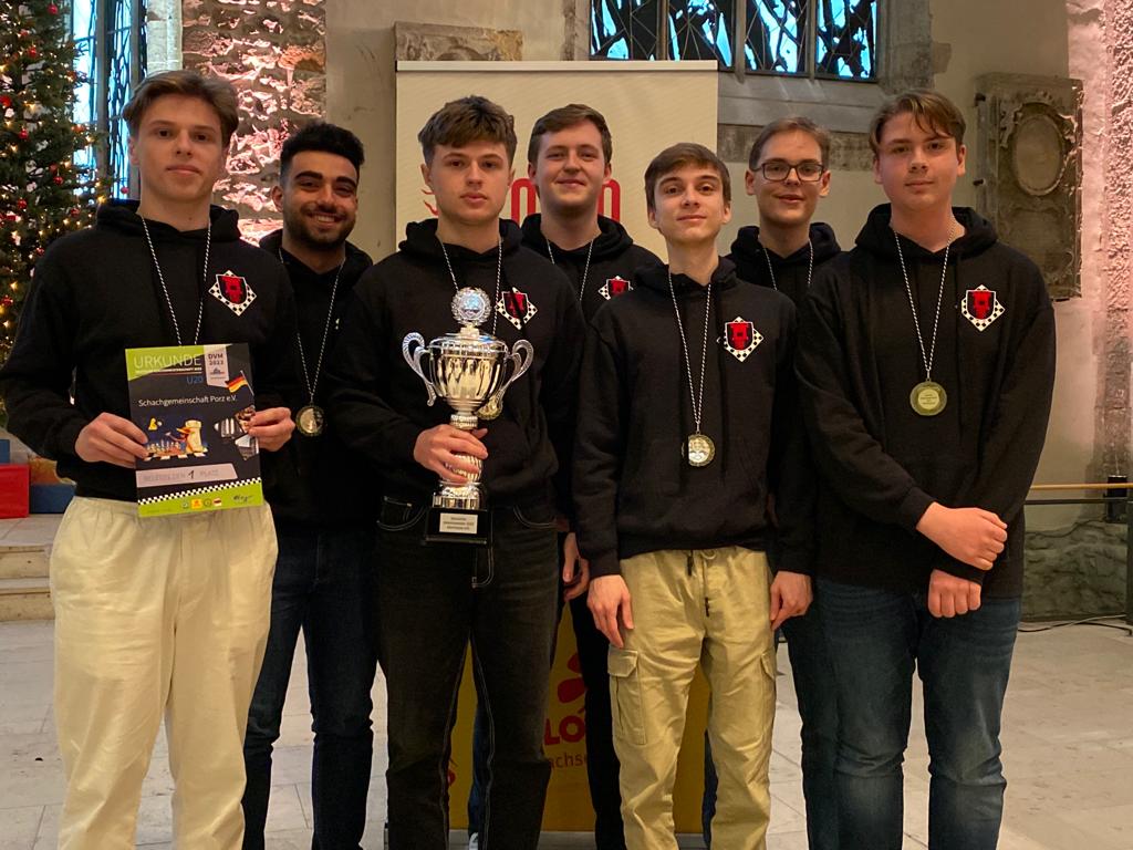 Als eines von acht Porzer Teams brach unsere U20 zur zentralen DVM in Magdeburg auf. Zum letzten Mal konnte der Kern unseres Teams aus dem „goldenen Jahrgang“ 2003 an der DVM teilnehmen und unser Team spielte bis auf wenige Veränderungen zum vierten Mal in derselben Besetzung. Alexander und Luca Suvorov besetzten die Spitzenbretter und Jonas Gallasch war erneut am 3. Brett. An den hinteren drei Brettern der Setzliste saßen erneut Borna Mohammadi Nia, Rafael Sabirov und Robin Gallasch. Die einzige Veränderung zu den letzten zwei Jahren gab es am vierten Brett – unser Neuzugang Christian Gluma (zuvor SG Bochum) nahm den Platz von Laurin Perkampus ein, der in den letzten drei Jahren dabei war, diesmal aber nicht bei der DVM dabei sein konnte und uns aus der Ferne die Daumen drückte.