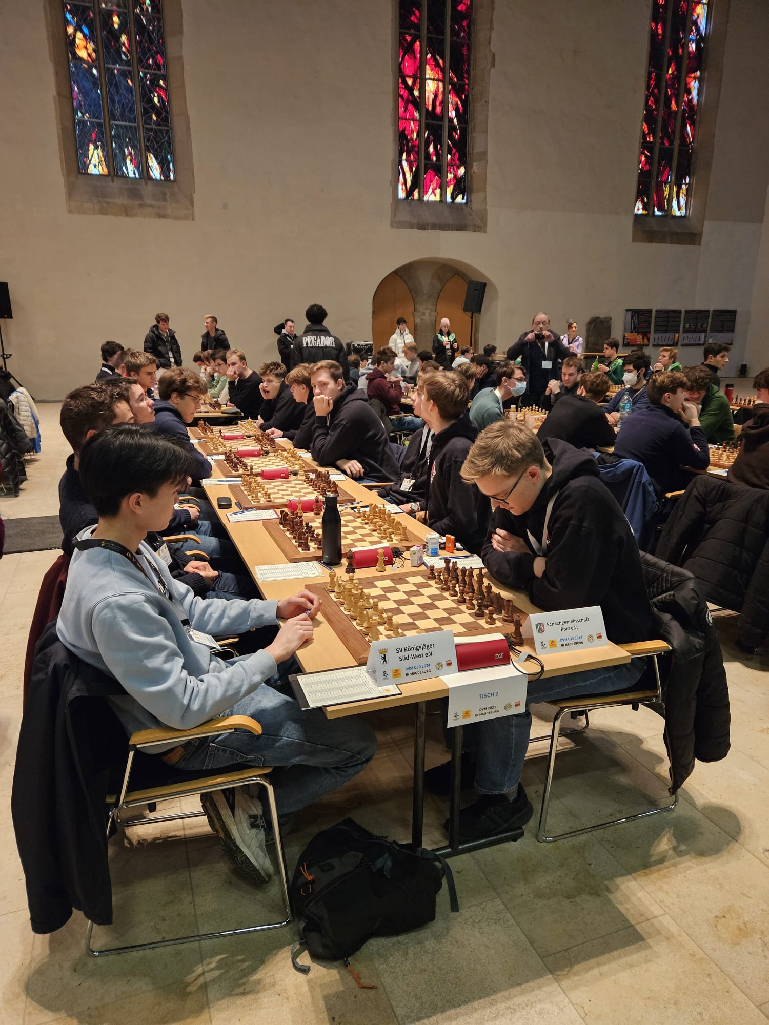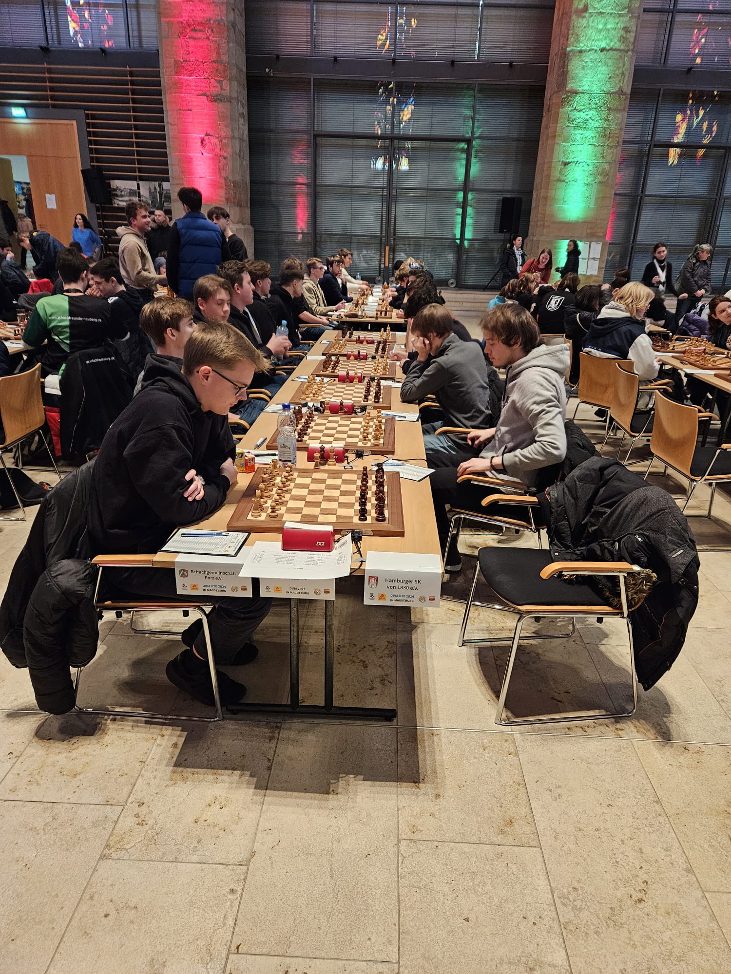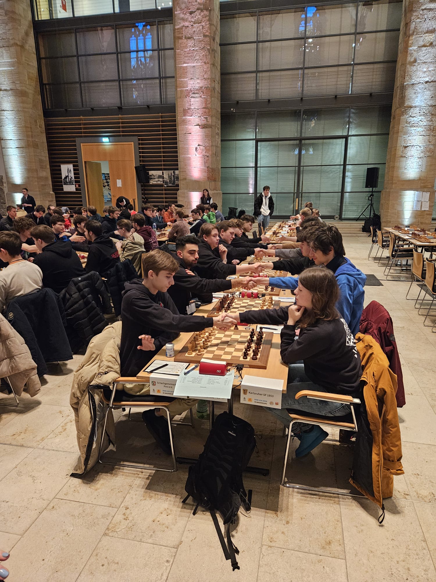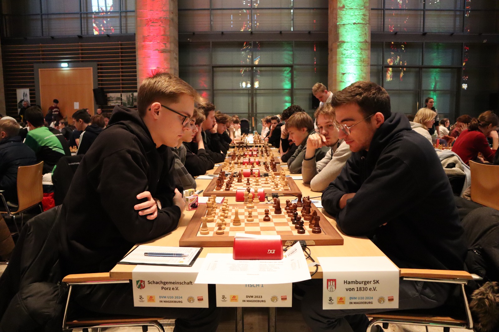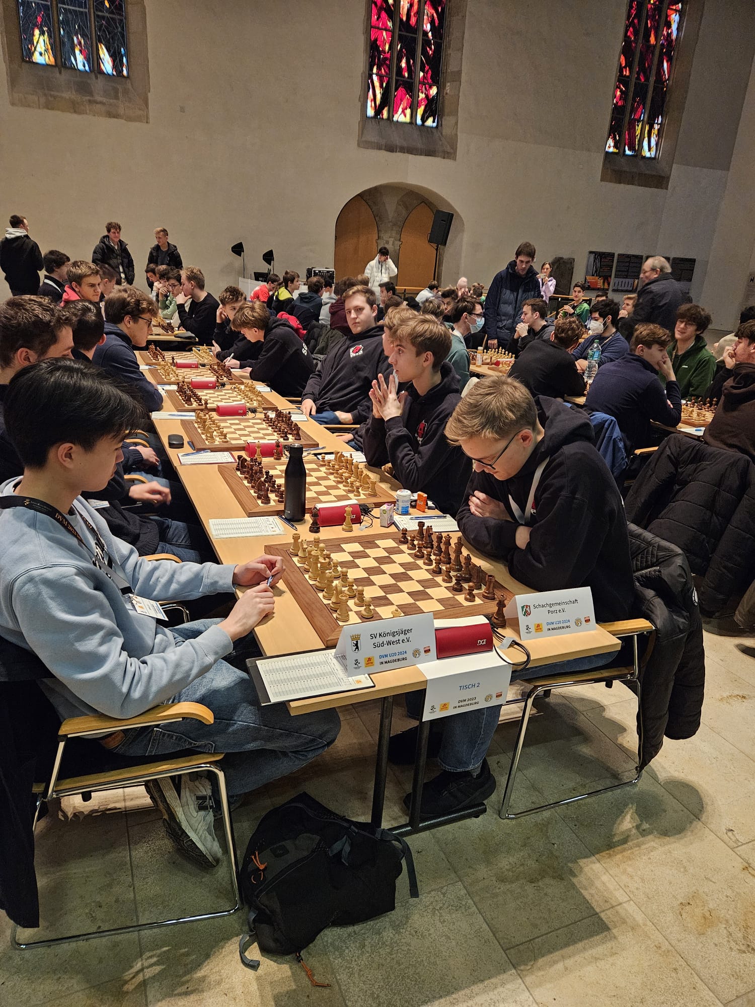 Als eines von acht Porzer Teams brach unsere U20 zur zentralen DVM in Magdeburg auf. Zum letzten Mal konnte der Kern unseres Teams aus dem „goldenen Jahrgang“ 2003 an der DVM teilnehmen und unser Team spielte bis auf wenige Veränderungen zum vierten Mal in derselben Besetzung. Alexander und Luca Suvorov besetzten die Spitzenbretter und Jonas Gallasch war erneut am 3. Brett. An den hinteren drei Brettern der Setzliste saßen erneut Borna Mohammadi Nia, Rafael Sabirov und Robin Gallasch. Die einzige Veränderung zu den letzten zwei Jahren gab es am vierten Brett – unser Neuzugang Christian Gluma (zuvor SG Bochum) nahm den Platz von Laurin Perkampus ein, der in den letzten drei Jahren dabei war, diesmal aber nicht bei der DVM dabei sein konnte und uns aus der Ferne die Daumen drückte.