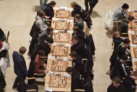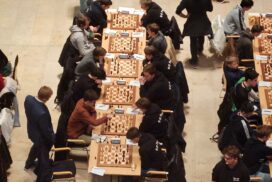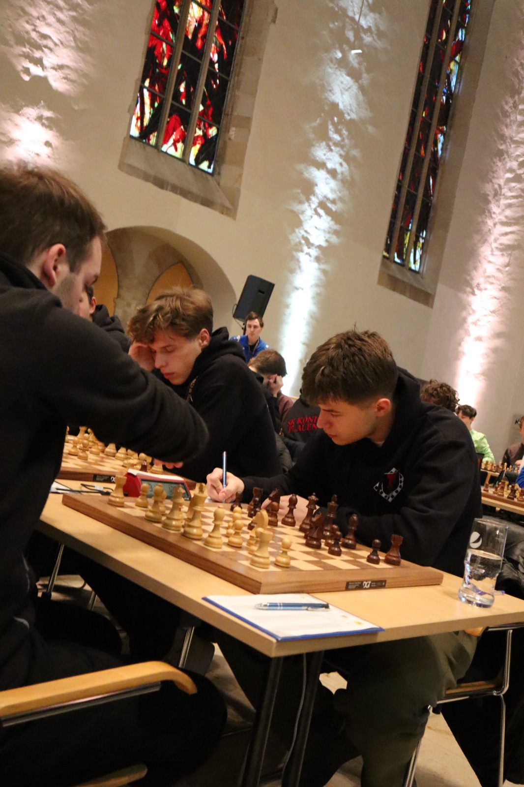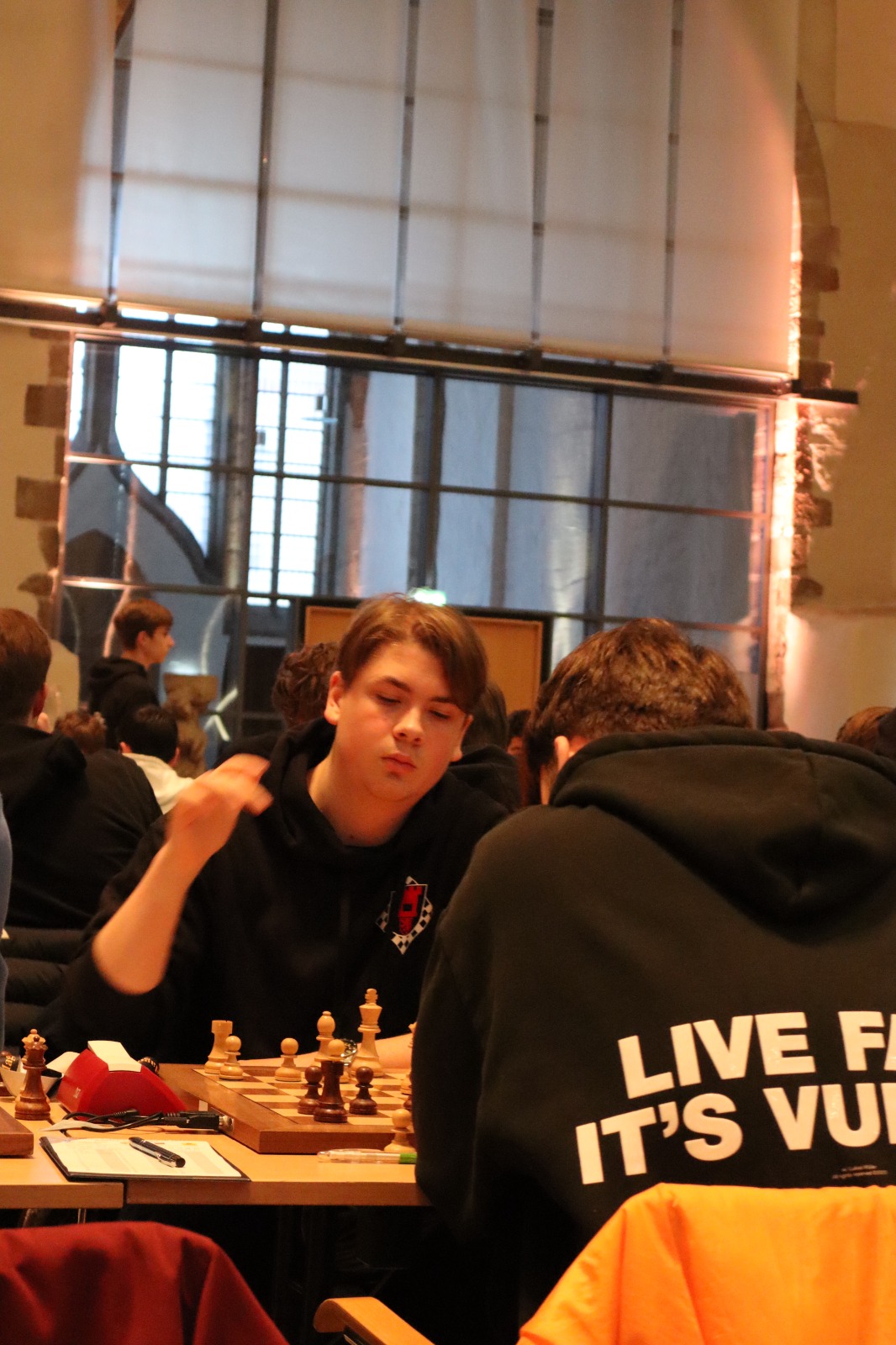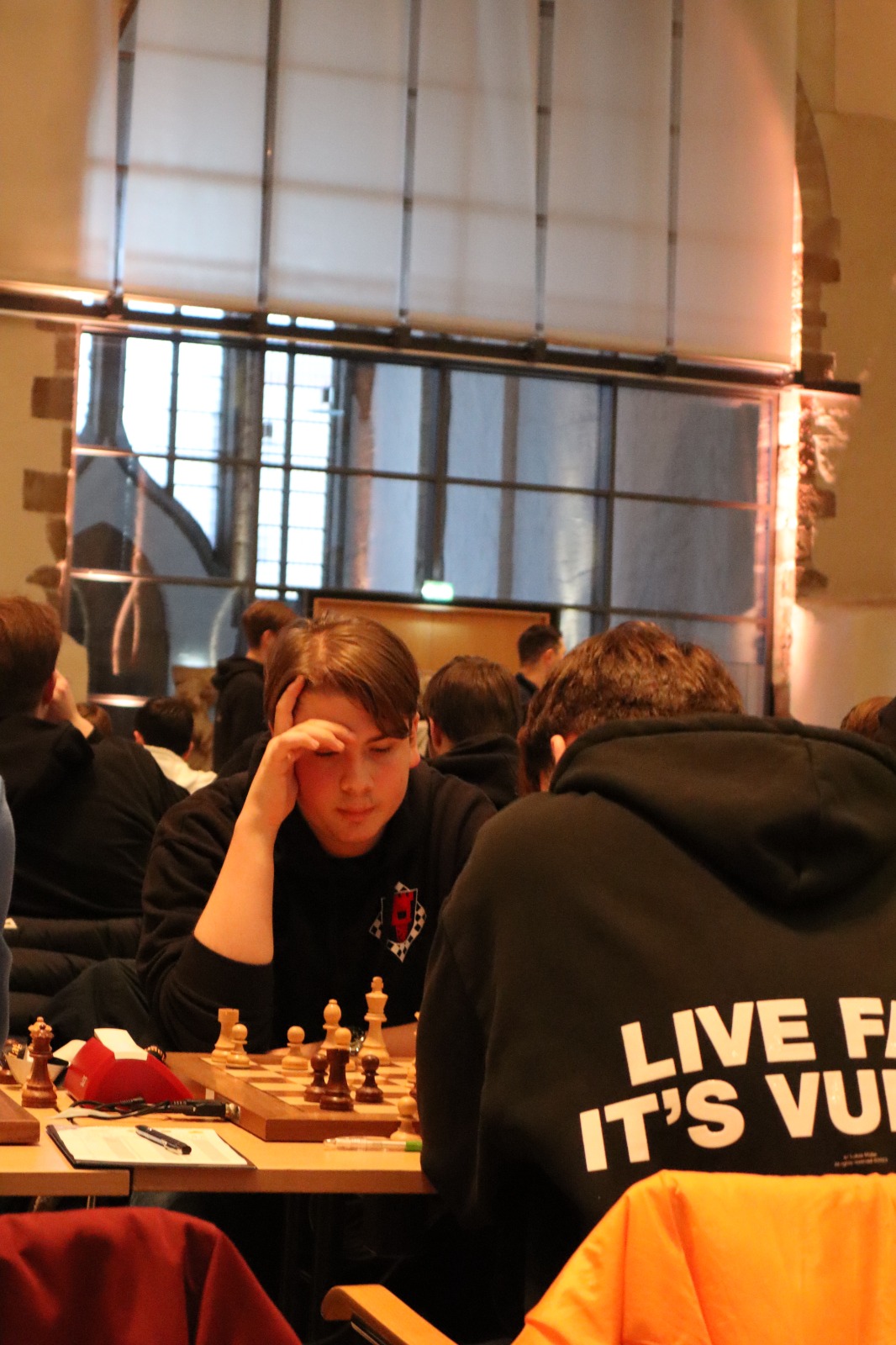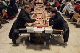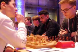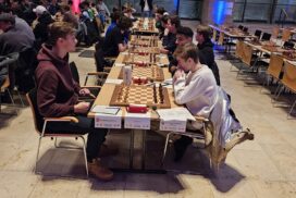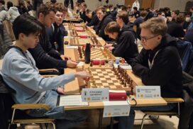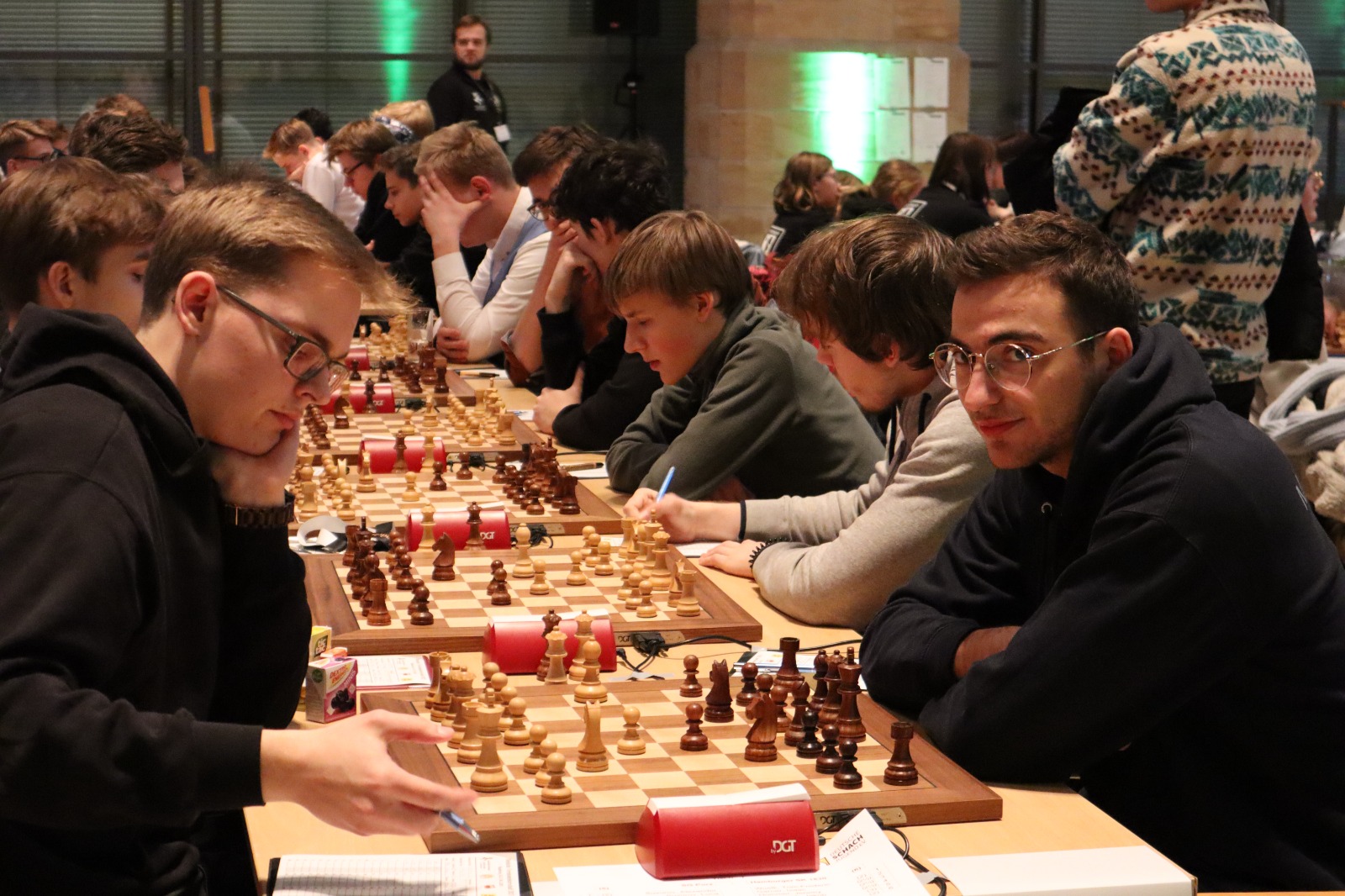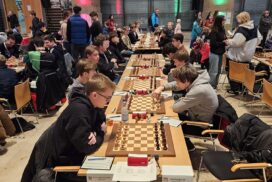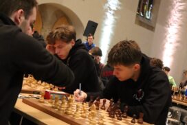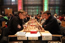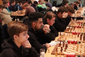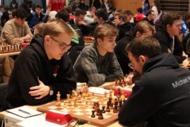 Es war erneut angerichtet – der Showdown gegen den HSK. Erneut in Runde 4, und erneut der wahrscheinlich stärkste U20-Mannschaftskampf in der Geschichte der DSJ. Über die Spitzenbretter, an denen jeweils Fide-Meister gegen Fide-Meister spielen, gibt es vergleichsweise wenig zu berichten. Alex und Tom Woelk neutralisieren sich recht schnell und rauchen nach 21 Zügen die Friedenspfeife. Wenig länger dauert die Partie von Jonas gegen Jeremy Hommer, auch wenn es in der Schlussstellung sicherlich einfacher für Jeremy wäre, im Gewinnsinne weiterzuspielen. Lucas Partie dauerte zwar bis nach der Zeitkontrolle, insgesamt war das Spiel gegen Isaac Garner aber wohl immer innerhalb der Remisbreite und ein Unentschieden das folgerichtige Ergebnis.