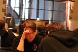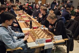 Der insgesamt etwas wackelige Eindruck des ersten Tages bestätigte sich dann in Runde 3 gegen den SK König Plauen aus Sachsen. Das Team war nominell schwächer als Neuberg, hatte jedoch in Runde zwei für die einzige Überraschung an den Spitzenbrettern gesorgt und die höher eingeschätzten Karlsruher geschlagen. Lediglich die Partien von Jonas (Weißsieg) und mit Abstrichen von Luca (Schwarzremis, allerdings gegen deutlich schwächeren Gegner) waren ohne grobe Schnitzer und wir waren auf einem guten Weg zu straucheln. Alex unterschätzt in guter Stellung einen Gegenangriff seines Gegners fundamental und verliert, Christian verrechnet sich eklatant und verliert. Wir liegen also 1,5:2,5 hinten und der Blick an die hinteren Bretter verleitet zum Katzenjammer – Borna hat einen Bauern ohne erkennbare Kompensation weniger und Rafaels Gegner überzeugt mit kreativem Angriffs- und Opferspiel gegen Rafaels König. Im weiteren Verlauf schafft Borna es zwar, seinen Gegner zu verwirren und den Ausgleich für unser Team zu erzielen, jedoch steht Rafael in eigener Zeitnot auf komplett auf Verlust, wohingegen sein Gegner noch fast eine halbe Stunde Zeit auf der Uhr hatte. Selbst als Rafaels Gegner zum Ende der Zeitnot eine Figur einstellt und Rafael in ein Endspiel mit Mehrspringer gegen zwei gefährliche Freibauern abwickeln kann, ist die Lage alles andere als klar. Es droht regelmäßig, dass Rafaels verbliebene Bauern geschlagen werden, womit die Partie nur remis enden würde, und eine zu sorglose Behandlung könnte sogar ganz nach hinten losgehen. Rafael verkehrt zügig erneut auf Inkrement für den Rest der Partie und mehr als Remis ist objektiv nicht drin. Unter gütiger Mithilfe des Gegners gelingt es Rafael jedoch, seinen zentralen Freibauern gegen einen Randfreibauern einzutauschen und die Partie nach fünf Stunden zum 3,5:2,5-Sieg zu führen und uns das große Spiel gegen Hamburg zu bereiten, die parallel locker und flockig mit 5,5:0,5 gegen Münster – zur Erinnerung: nomineller erster Verfolger von uns und dem HSK – gewannen.