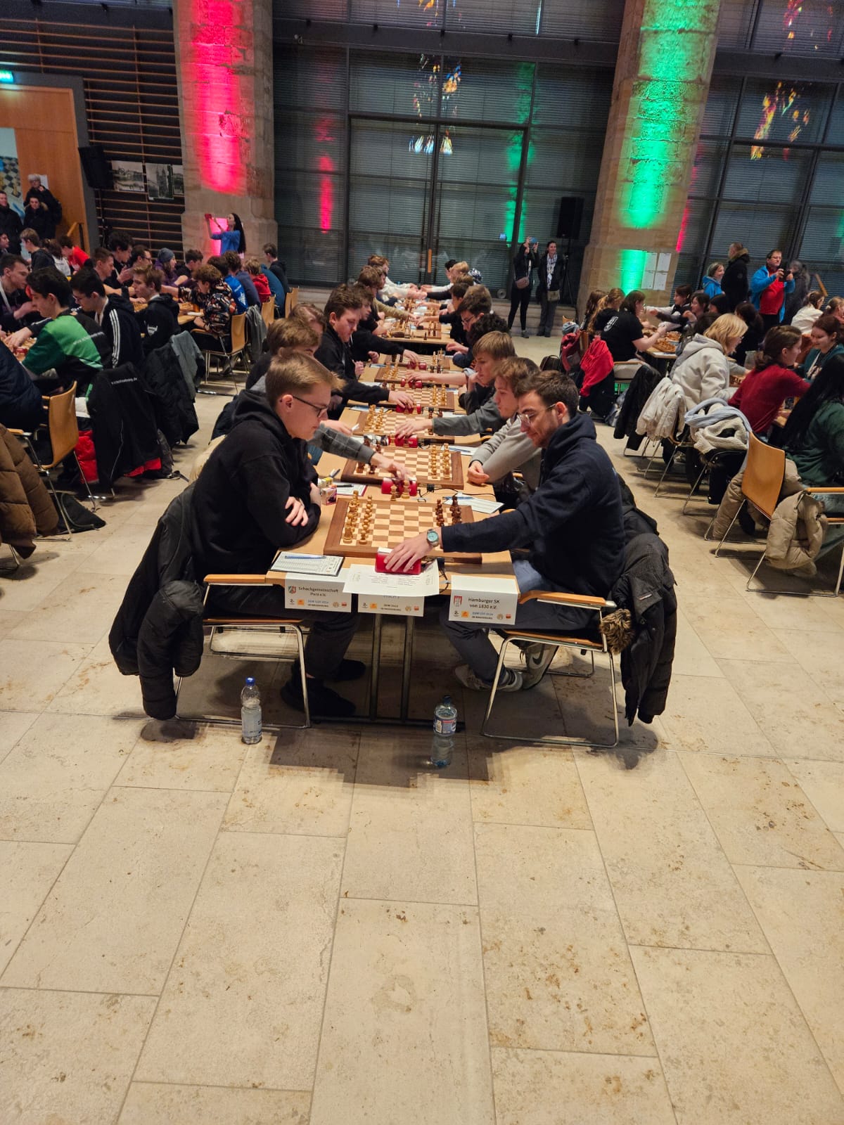 Die Erlebnisse der letzten DVM (siehe hier), bei der wir der beste Vizemeister aller Zeiten wurden, waren einerseits schmerzhaft, aber vor allem auch als Ansporn genommen, sich im Laufe des Jahres 2023 kontinuierlich zu verbessern. So hat sich das Team von einem DWZ-Schnitt von 2180 im letzten Jahr auf 2238 verbessert, fast alle haben unmittelbar vor der DVM noch erfolgreich bei diversen Turnieren gespielt und so den Schnitt auf ein neues Rekordniveau angehoben. Trotzdem waren wir erneut nur an zweiter Position hinter dem Hamburger SK (HSK) gesetzt, die uns in 2022 denkbar knapp geschlagen haben. Zwar waren beim HSK einzelne Spieler und vor allem ihr Spitzenbrett GM Luis Engel (der nun als Teamcaptain vor Ort weilte) der U20 entwachsen, aber auch der HSK betreibt eine vorbildliche Jugendarbeit und bringt stetig neue Talente hervor bzw. ist ein attraktives Ziel für ambitionierte SpielerInnen in ganz Norddeutschland. Mit einem DWZ-Schnitt von 2245 blieb der HSK knapp an der Spitze und nur unwesentlich unterhalb seines Vorjahresschnitts (2260).