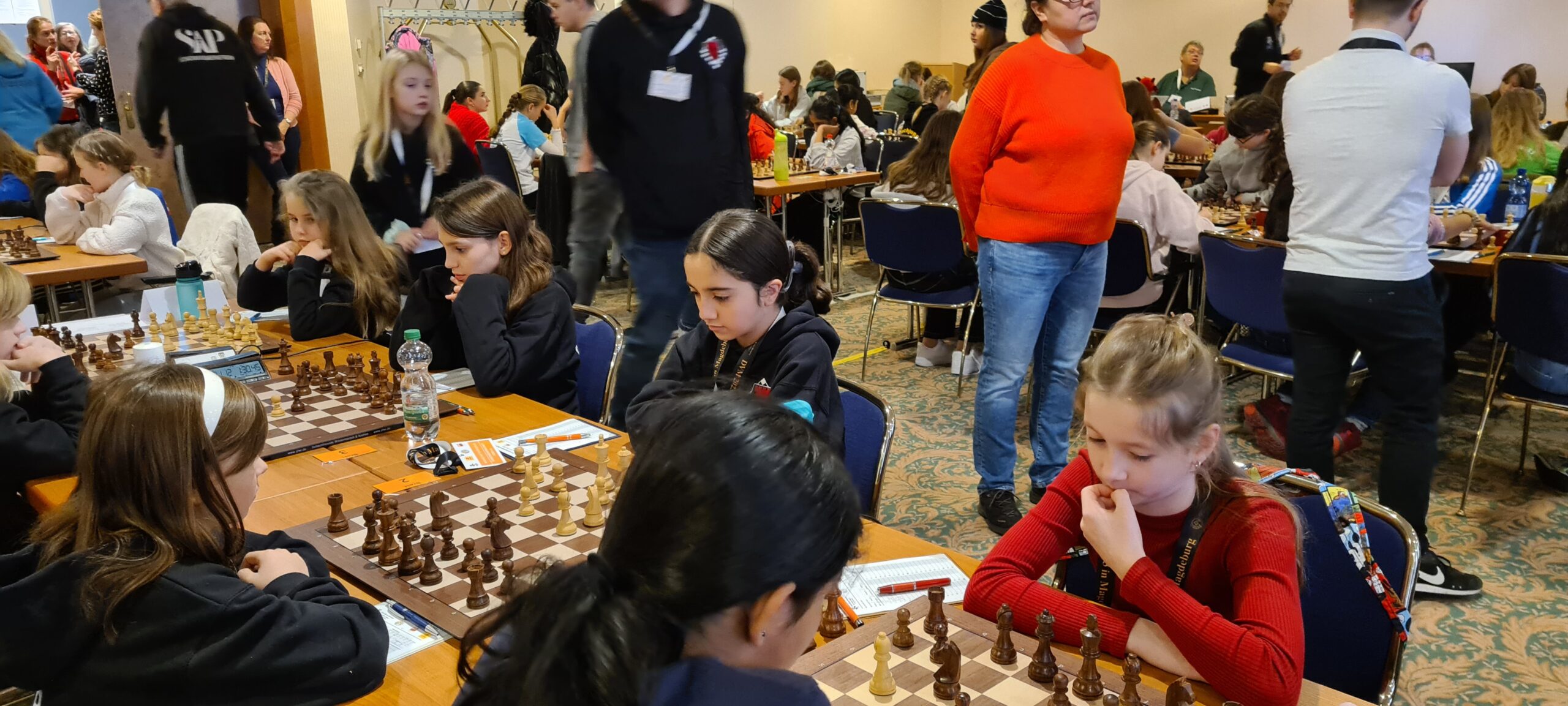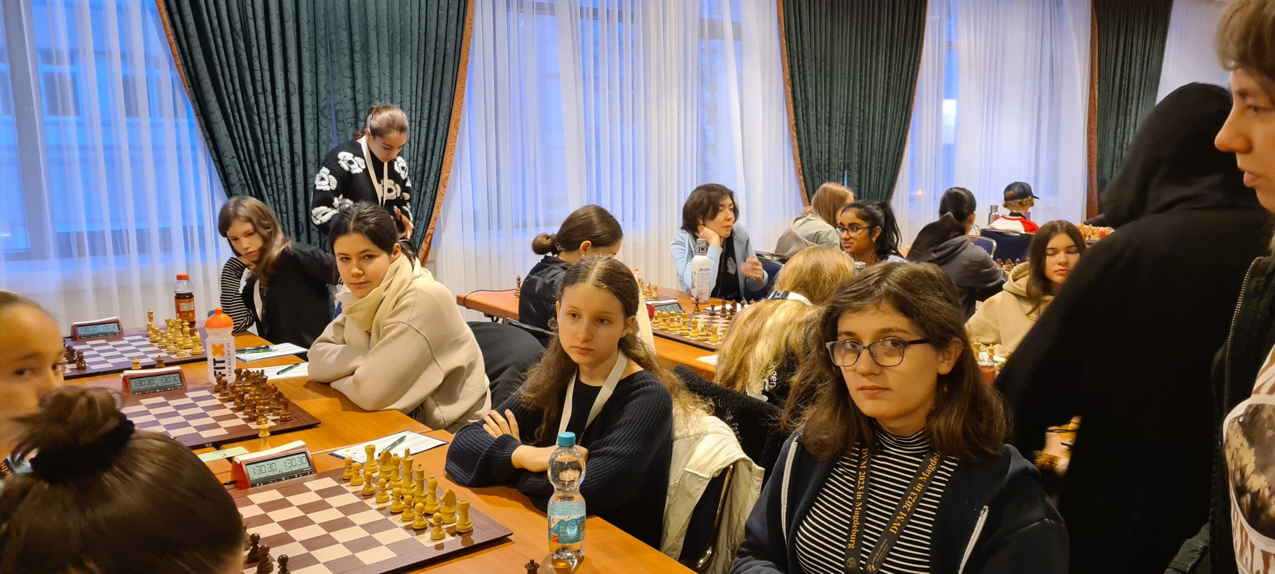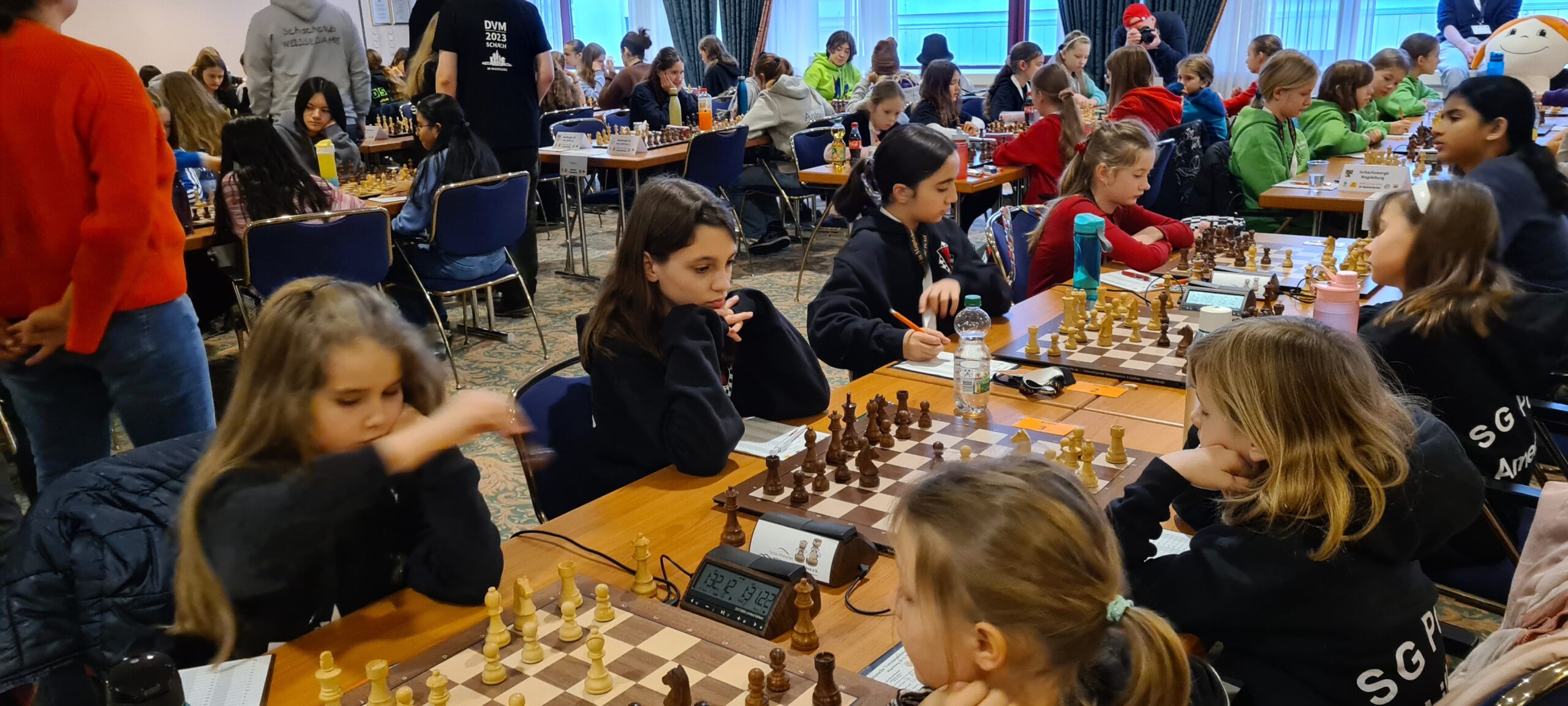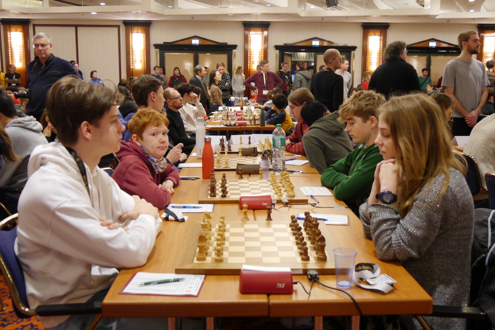 Doch für die nun stattgefundene DVM griff die Deutsche Schachjugend das Thema noch einmal auf. Und so fand Ende Dezember die DVM erstmalig an einem zentralen Ort statt, nämlich in Magdeburg. Naja, so ganz stimmt das mit ‚zentraler Ort‘ dann doch nicht, denn aufgrund der schieren Größe dieser Veranstaltung (es waren knapp tausend Teilnehmer, dazu noch unzählige begleitende Eltern und Trainer) gab es eine Aufteilung. Während die U20 und die U20w im Hotel IBIS wohnten und ihre Turniere in der Johanniskirche austrugen, spielten alle anderen Altersklassen im Hotel Maritim und waren entweder in ebendiesem oder in der direkt nebenan gelegenen Jugendherberge untergebracht.