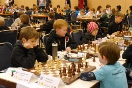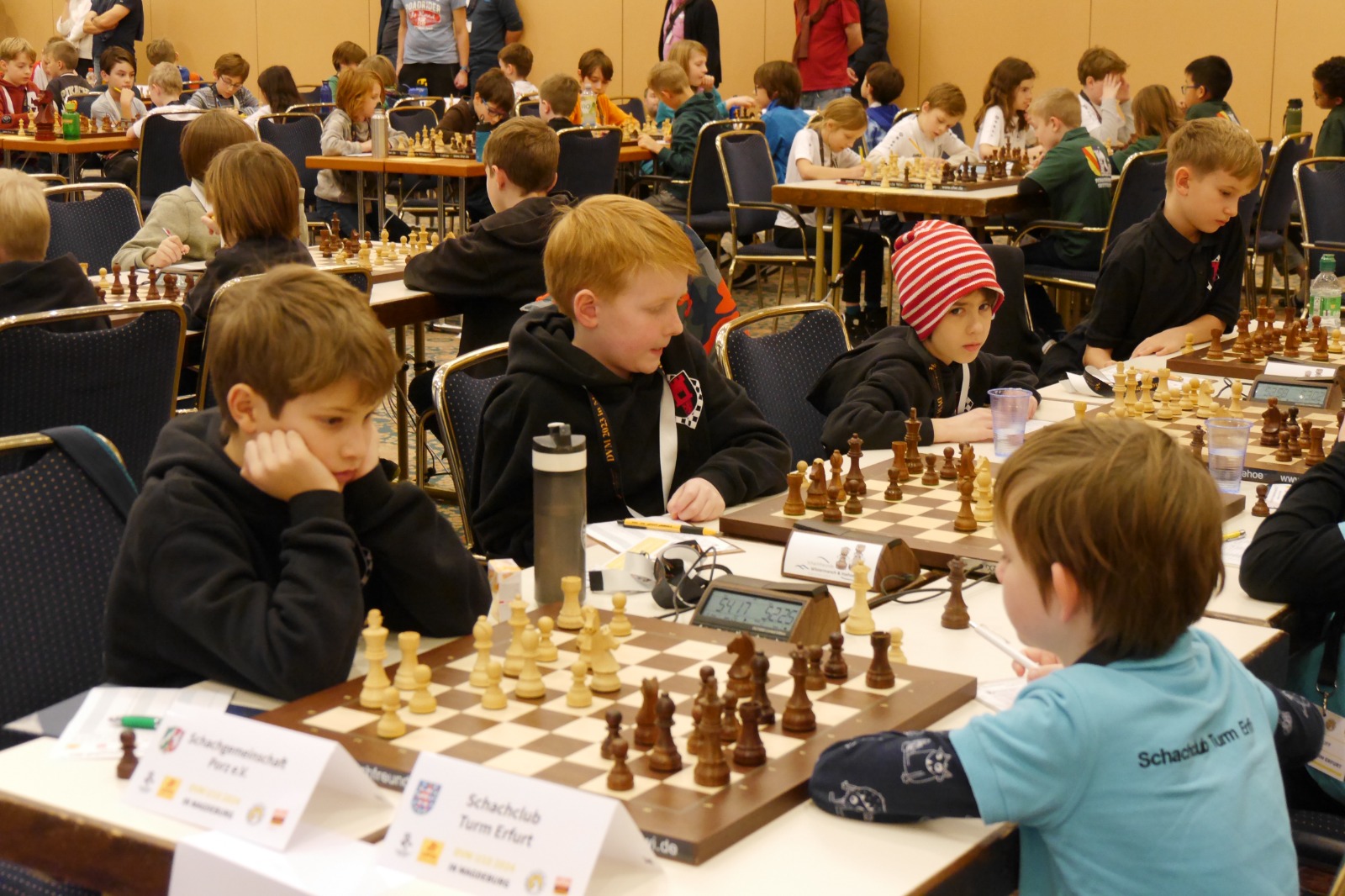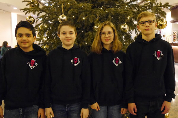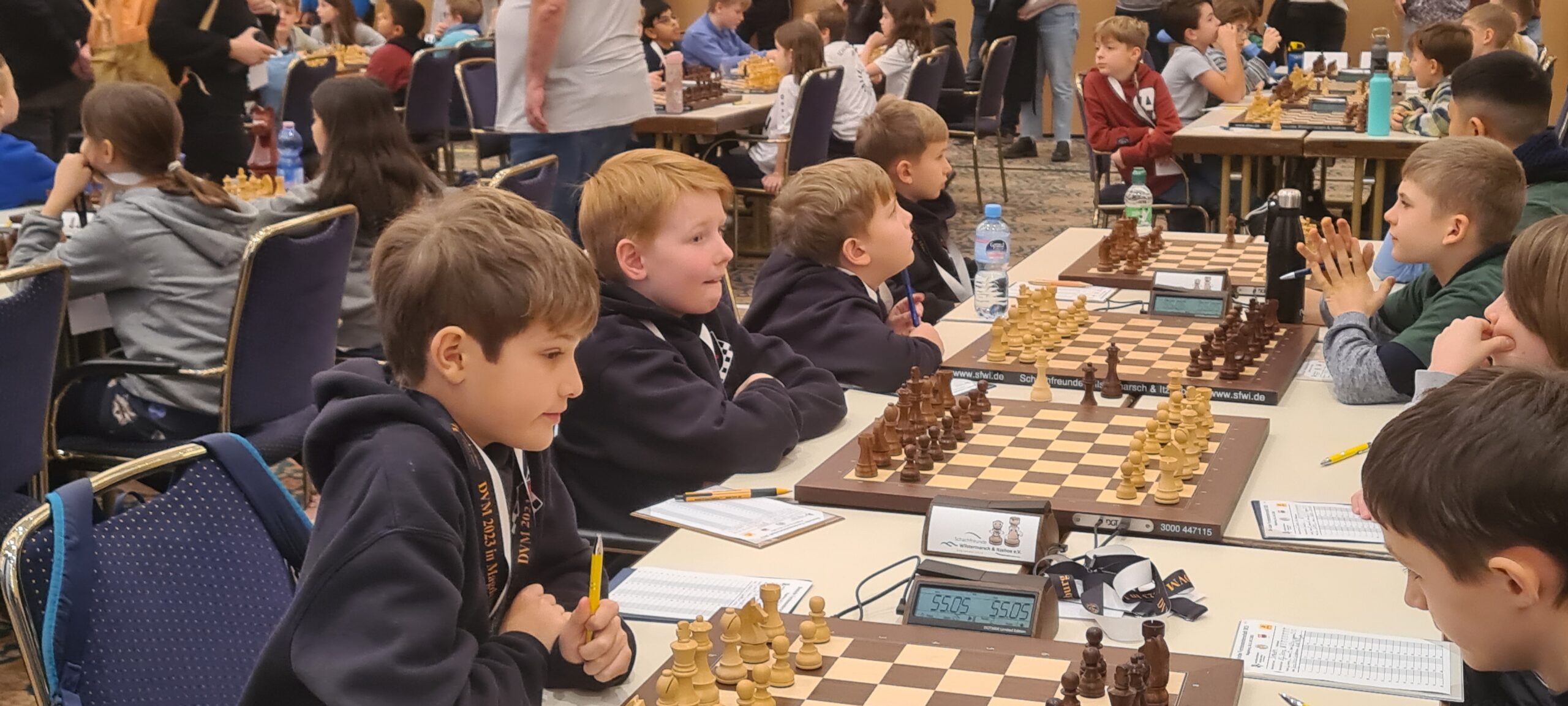 Die Altersklasse U10 spielt ein leicht verkürztes Turnier; zwar auch mit sieben Runden, aber in nur drei Tagen und mit deutlich kürzerer Bedenkzeit gegenüber den anderen Altersklassen. Vielleicht lag es an dieser kurzen Bedenkzeit, vielleicht aber auch an einer gewissen Nervosität verursacht durch die doch recht imposante Turnier-Umgebung. Jedenfalls lief es am ersten Tag des Turniers gar nicht, doch die Mannschaft wusste sich zu steigern. Am Ende landete man auf dem 22. Platz (von 40 Mannschaften) und damit genau auf dem Platz, auf dem man zu Beginn des Turniers auch gesetzt war. Das kann man dann wohl als Punktlandung bezeichnen.