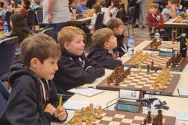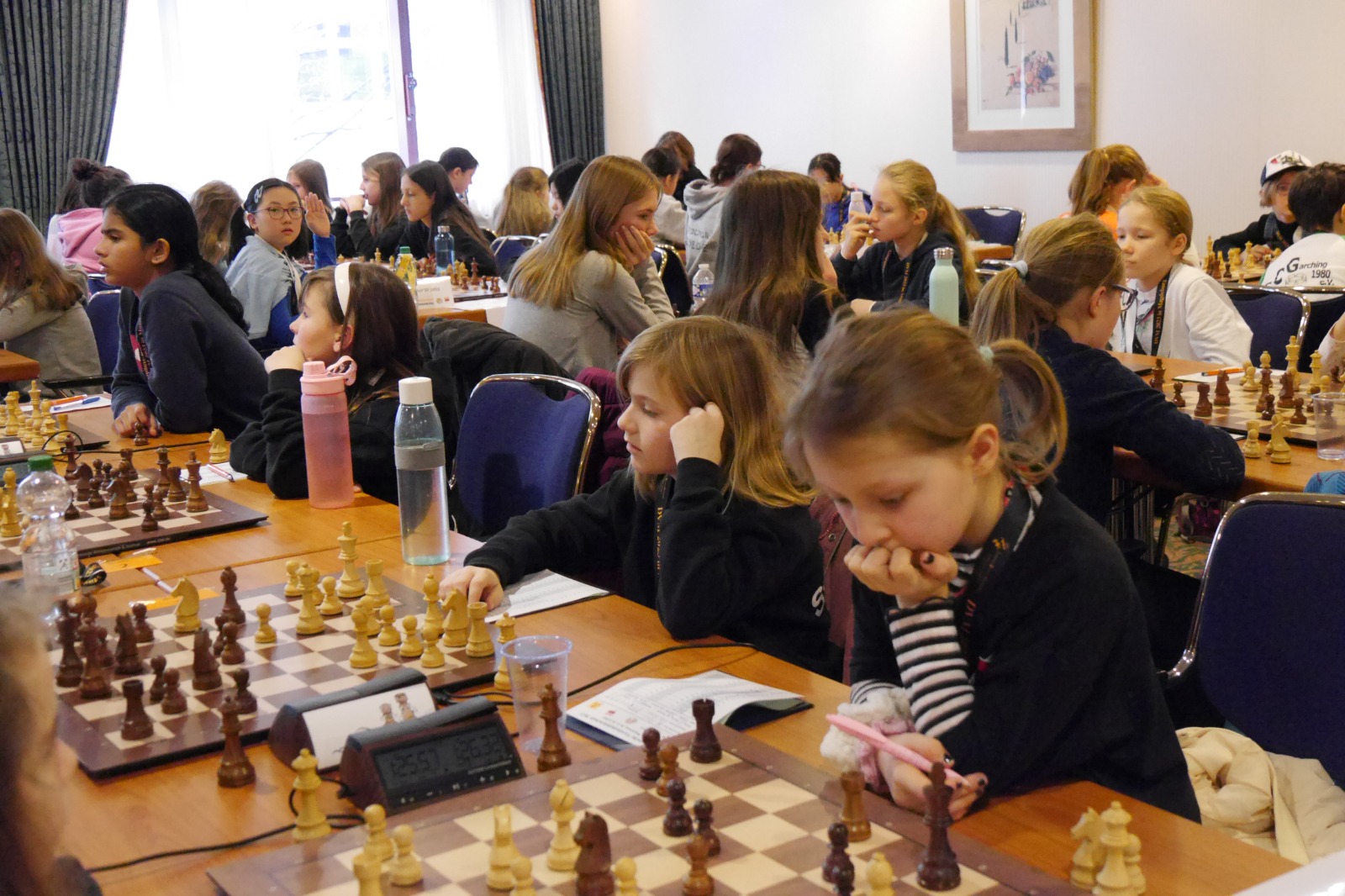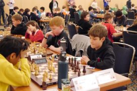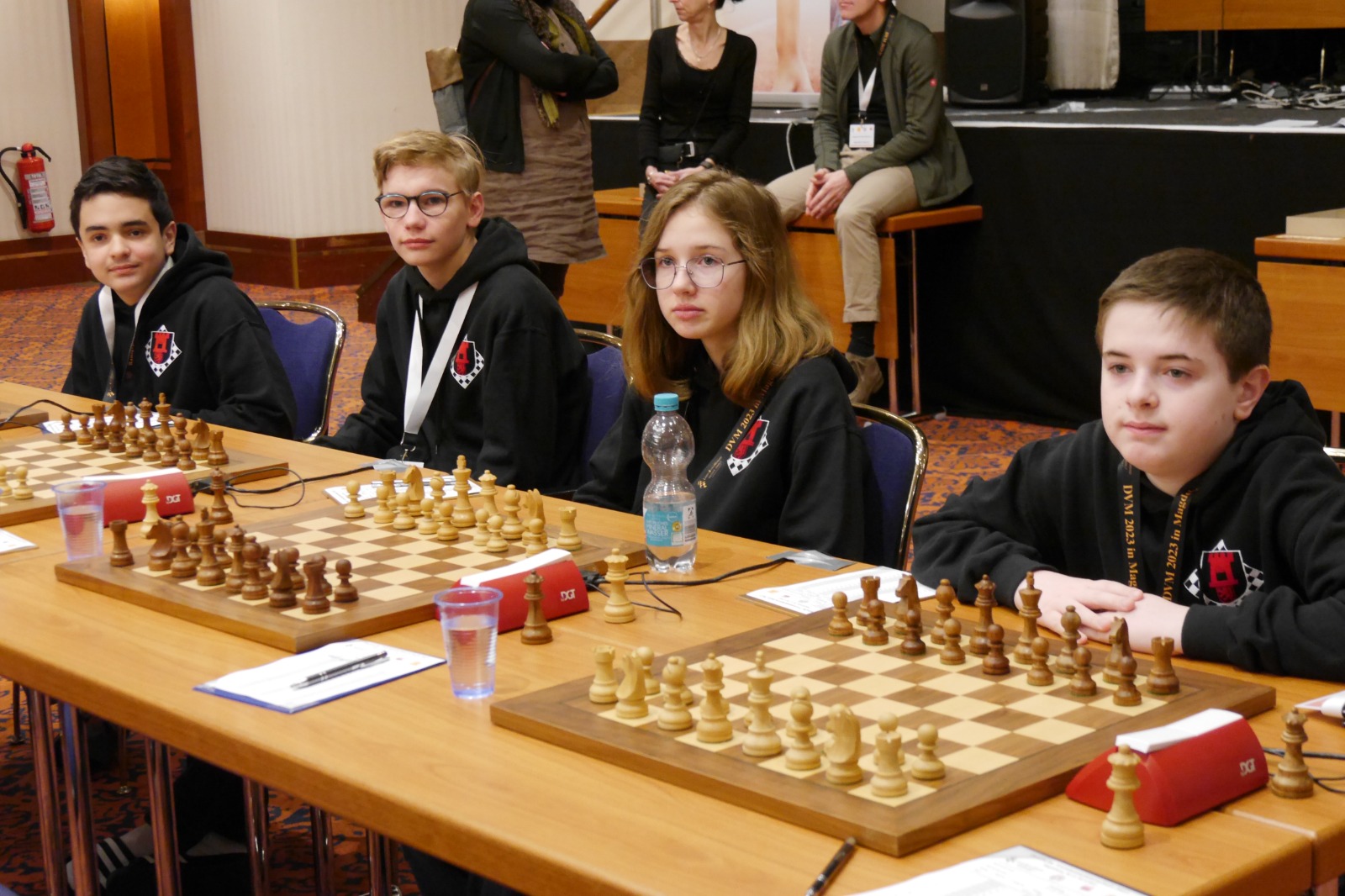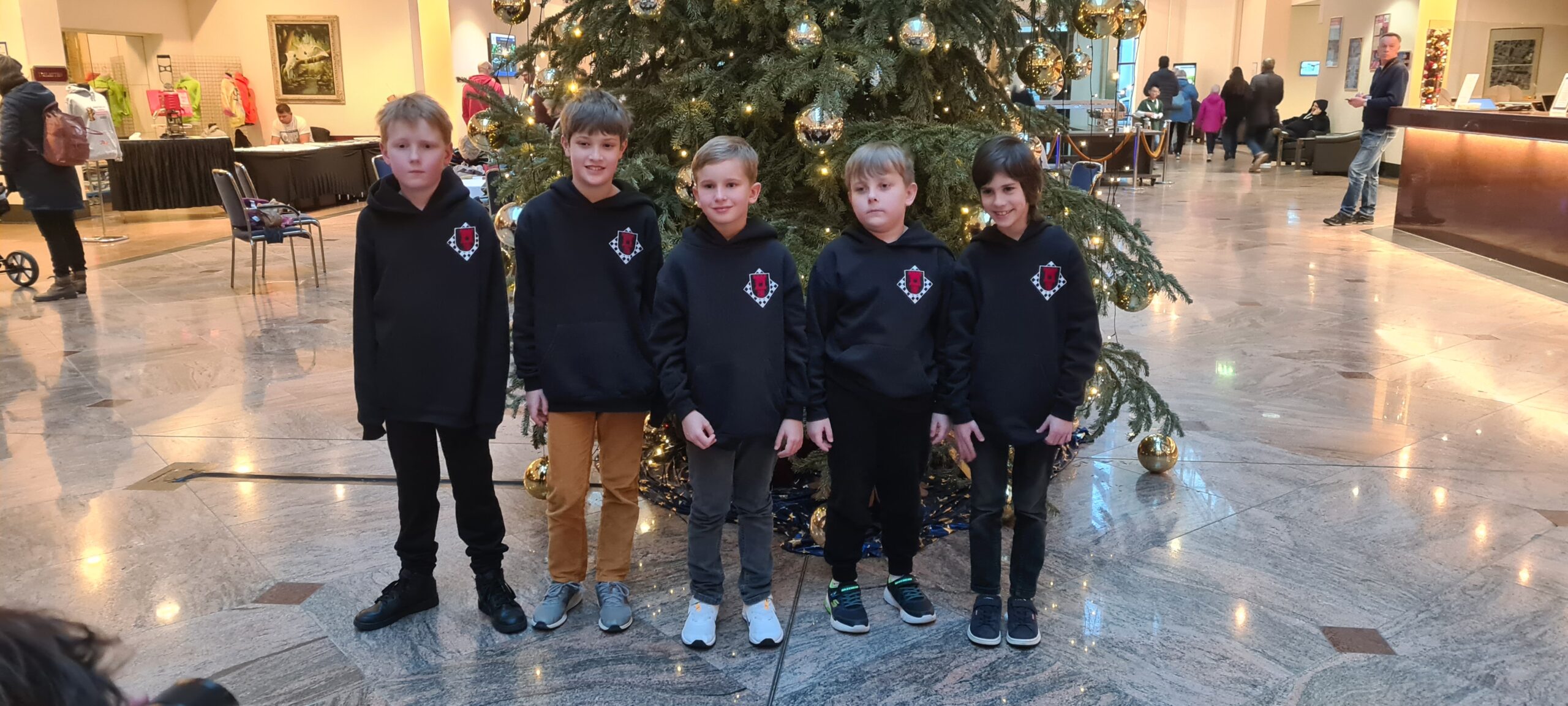 Die Altersklasse U10 spielt ein leicht verkürztes Turnier; zwar auch mit sieben Runden, aber in nur drei Tagen und mit deutlich kürzerer Bedenkzeit gegenüber den anderen Altersklassen. Vielleicht lag es an dieser kurzen Bedenkzeit, vielleicht aber auch an einer gewissen Nervosität verursacht durch die doch recht imposante Turnier-Umgebung. Jedenfalls lief es am ersten Tag des Turniers gar nicht, doch die Mannschaft wusste sich zu steigern. Am Ende landete man auf dem 22. Platz (von 40 Mannschaften) und damit genau auf dem Platz, auf dem man zu Beginn des Turniers auch gesetzt war. Das kann man dann wohl als Punktlandung bezeichnen.