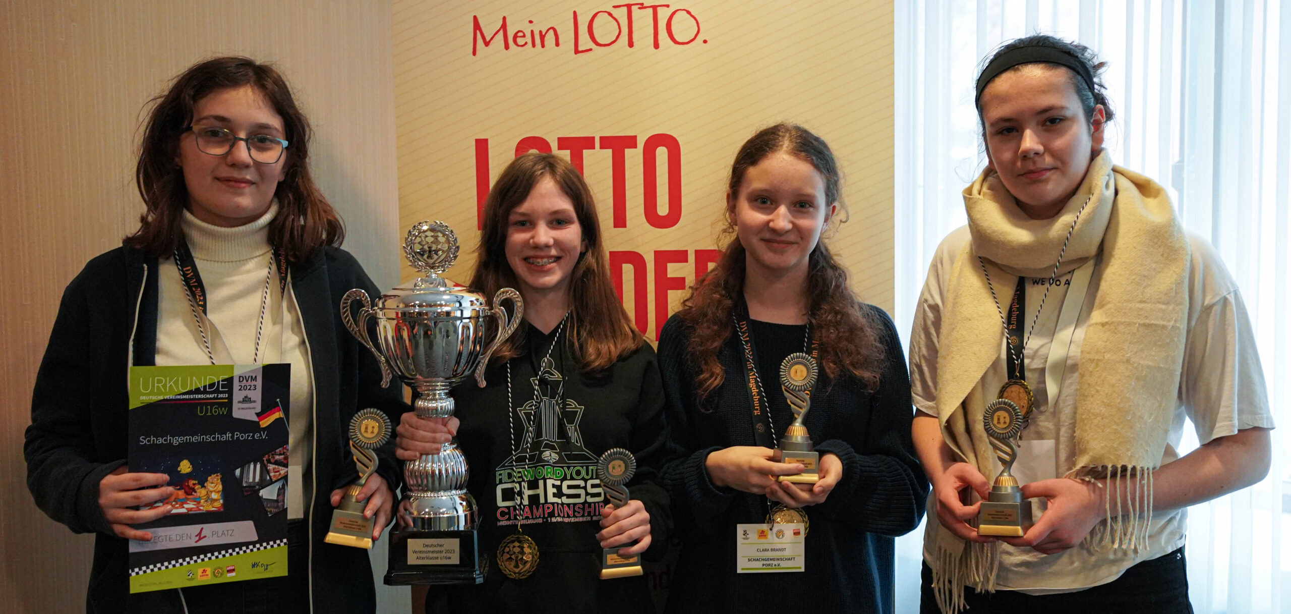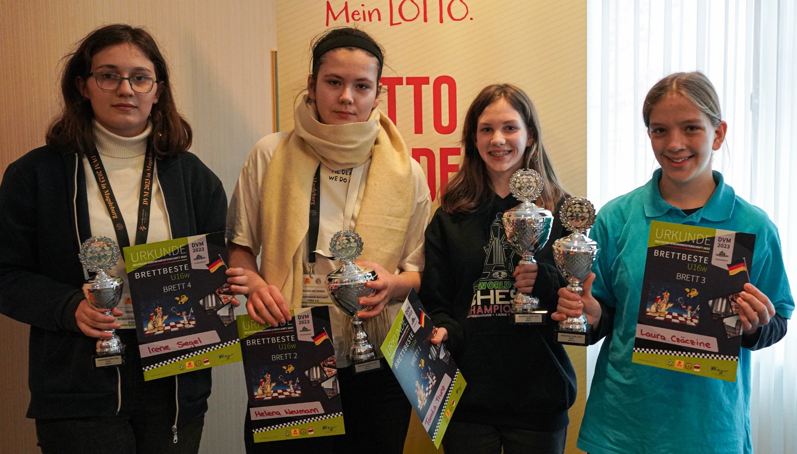 Aber vielleicht sollte man das ab jetzt immer so kurzfristig machen. 14:0 Mannschaftspunkte, drei von vier Brettpreisen, Deutscher Meister bereits eine Runde vor Schluss (was die Nerven des Mannschaftsführers doch sehr schonte), das alles spricht eine deutliche Sprache. Und das alles, obwohl man sogar zwei Spielerinnen an die U16 bzw. U14 abgeben musste und damit zu Beginn des Turniers ’nur‘ auf Nummer 3 der Setzliste stand. Daher auch an dieser Stelle noch einmal einen riesigen Glückwunsch an dieses überragende Team (Tamila Trunz, Helena Neumann, Clara Brandt und Irene Siegel)! Ich habe selten eine so souveräne Vorstellung während eines gesamten Turniers gesehen.