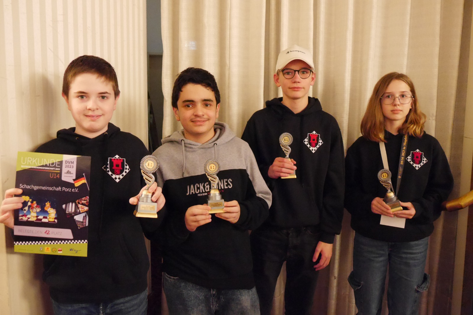 Die U14 musste ja ebenfalls eine Spielerin an die U16w abgeben (siehe oben) und so mussten die verbliebenen vier SpielerInnen jeweils alle 7 Partien bestreiten. In den ersten Runden lief das auch sehr gut und man spielte ganz oben mit. Unter anderem schaffte man ein Unentschieden gegen den späteren Vizemeister. Doch dann gab es in der zweiten Turnierhälfte einen kleinen Einbruch, den man erst mit einem Schlussrunden-Sieg wieder stoppen konnte. Mit dem 12. Platz (an Nummer 9 gesetzt) blieb das Ergebnis aber absolut im Rahmen.