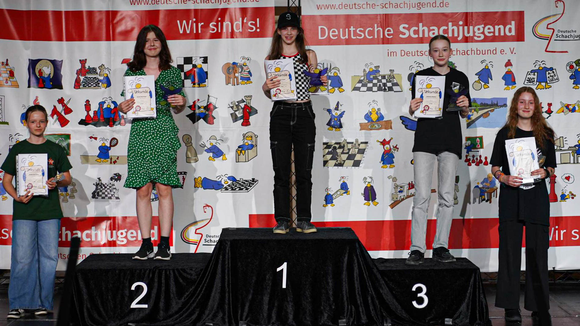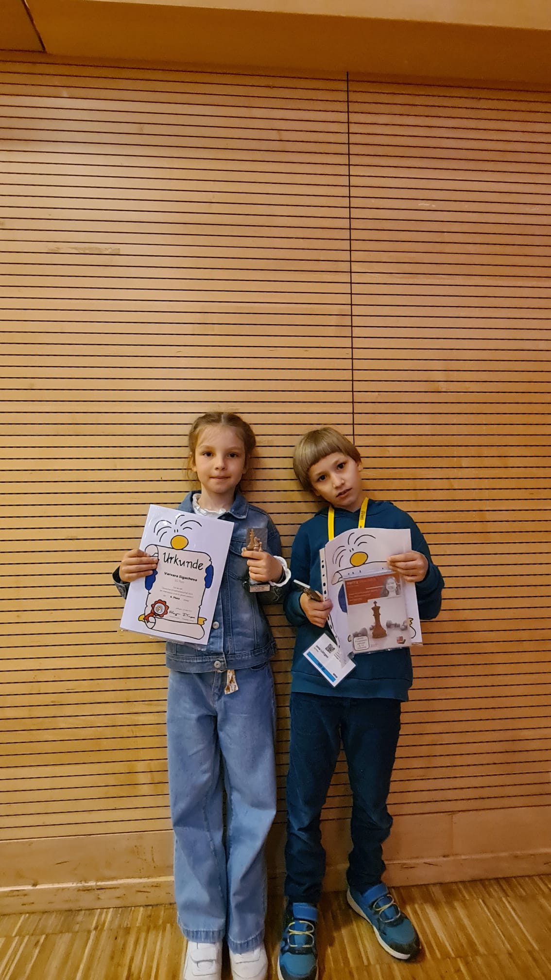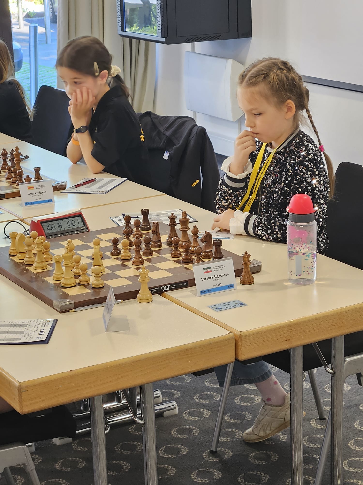Komplettiert wurde das hervorragende Porzer Ergebnis dadurch, dass auch unseren beiden Jüngsten der Sprung auf das erweiterte Podest (bei der Deutschen werden in allen Altersklassen immer die ersten fünf geehrt) gelang: Varvara Sigacheva erreichte Platz 4 in der Altersklasse U8w. Und Jona Lüttgen schaffte das Kunststück, als DWZ-loser Spieler (und damit am Ende des Feldes gesetzt) fünfter in der U8 zu werden.