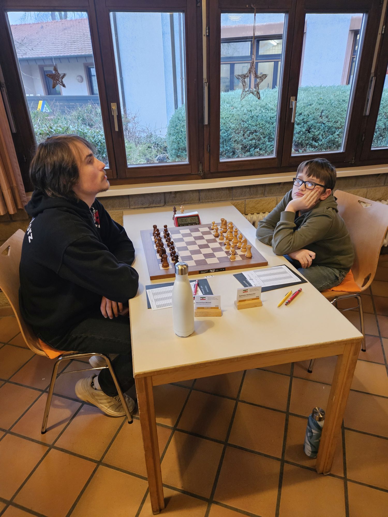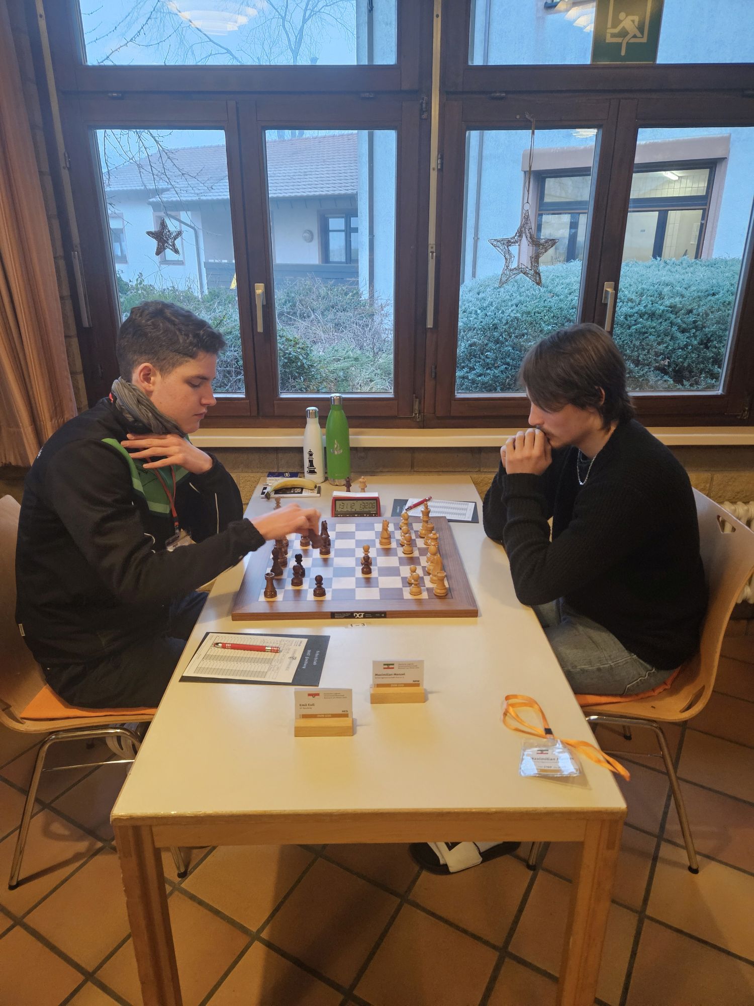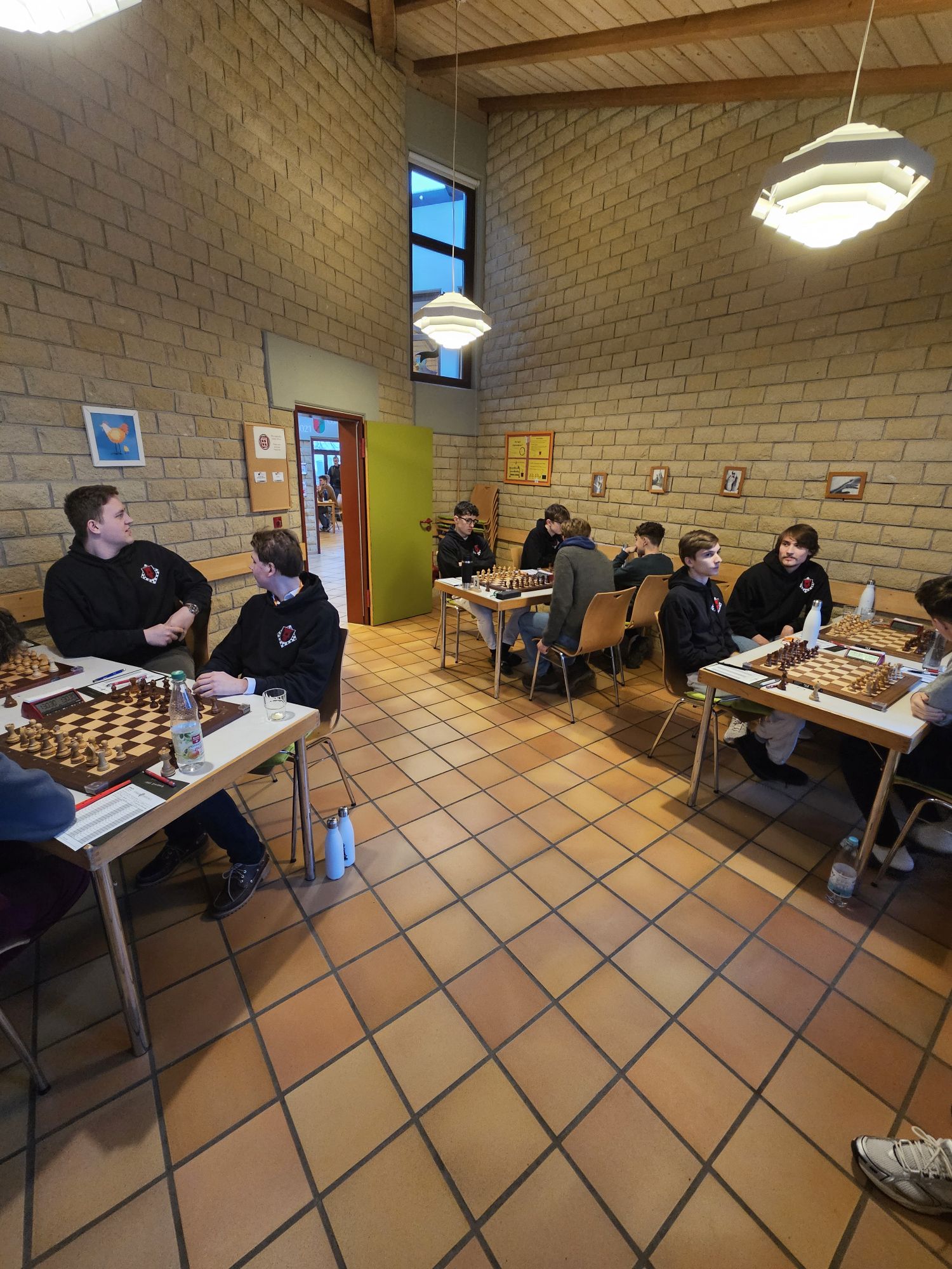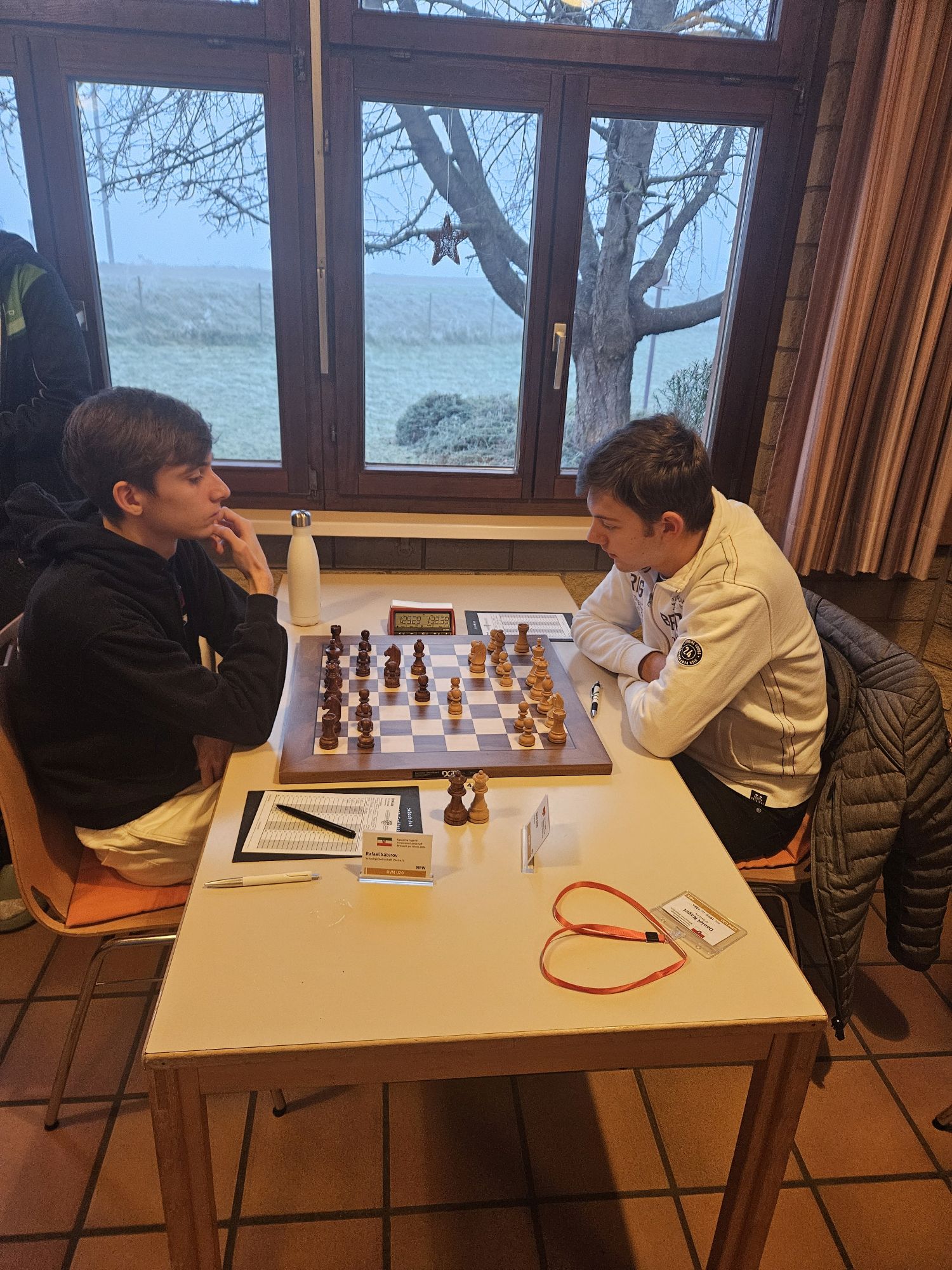 Unser Team war dabei nach dem altersbedingten Ausscheiden des „goldenen Jahrgangs“ 2003 gegenüber dem Vorjahr deutlich verändert – die Spitzenbretter besetzten FM Jonas Gallasch und Christian Gluma, die beim letztjährigen Titelgewinn auch schon dabei waren, außerdem blieb uns aus dem Vorjahresteam noch Rafael Sabirov erhalten, der das 4. Brett besetzte. Die freien Plätze in der Mannschaft besetzten Maximilian Menzel (Brett 3), der in den letzten zwei Jahren einen extremen Leistungssprung gezeigt hat, Victor Kruse (Brett 5), der vor Beginn der letzten Saison vom SK Köln-Südwest zu uns gewechselt ist, sowie Julian Kliffken (Brett 6), der uns zwar zum Beginn dieser Saison Richtung Eschweiler verlassen hat, aber für die DVM 2024 noch für uns spielberechtigt war. Auch Julian, der 2023 in unserem U16-Team das vierte Brett besetzt hat, hat in den vergangenen 12 Monaten einen mächtigen Leistungssprung gezeigt und seine DWZ von rund 1500 auf knapp 2000 geschraubt. Als Trainer konnten wir unser letztjähriges Spitzenbrett der U20-Mannschaft und Zweitligaspieler FM Alexander Suvorov gewinnen und auch Thomas Gluma war als Organisator und Mädchen für alles wieder dabei.