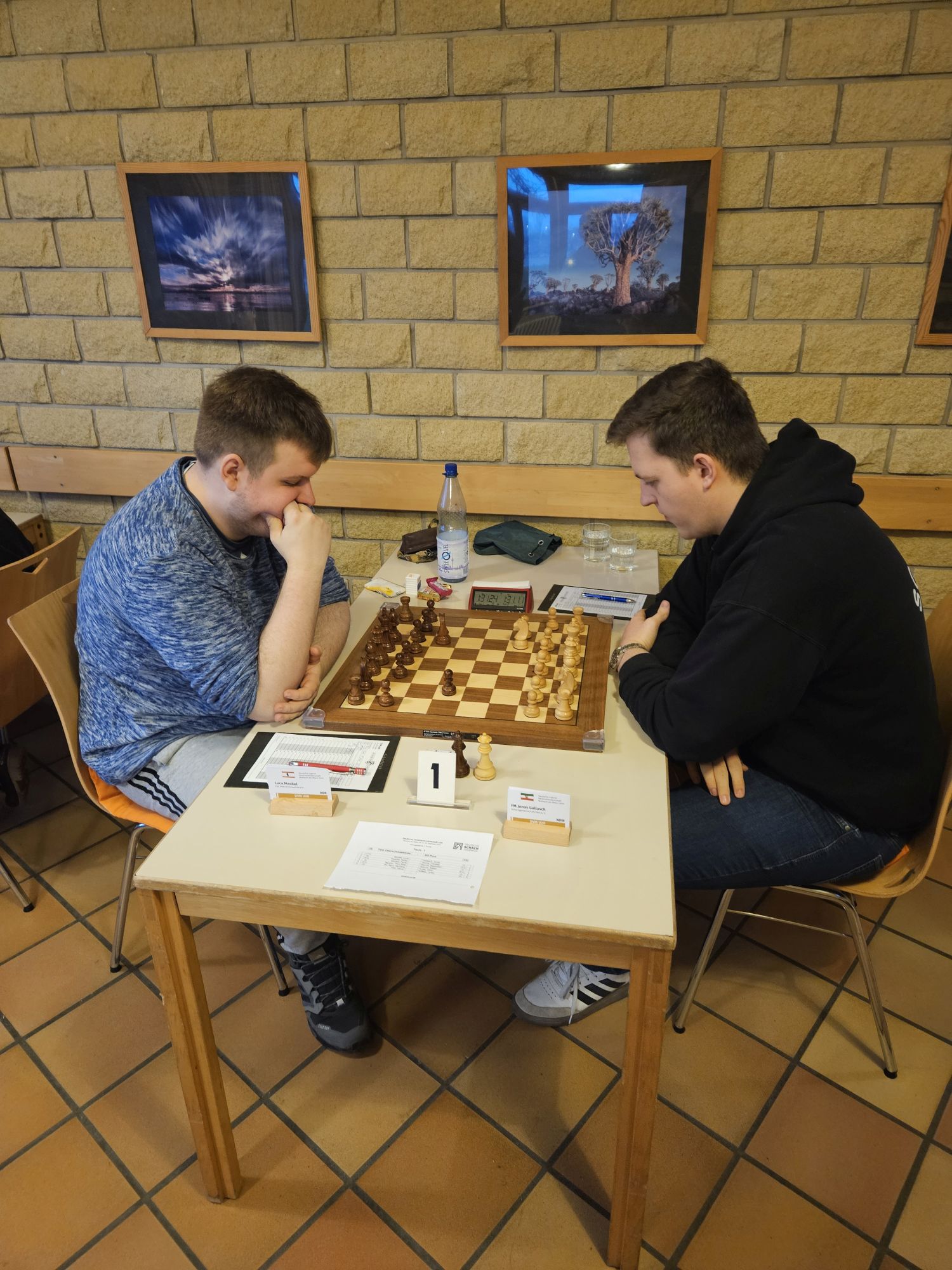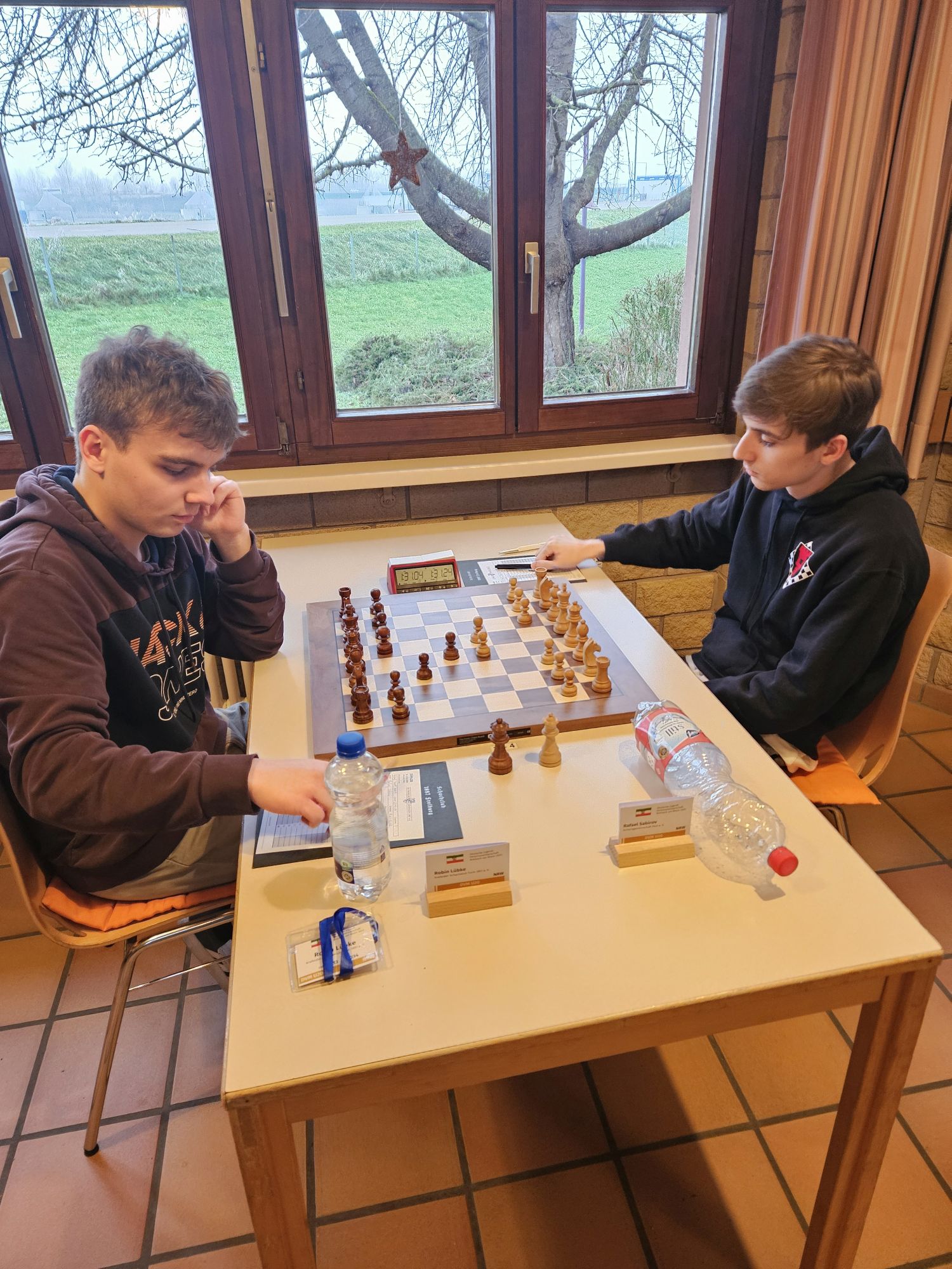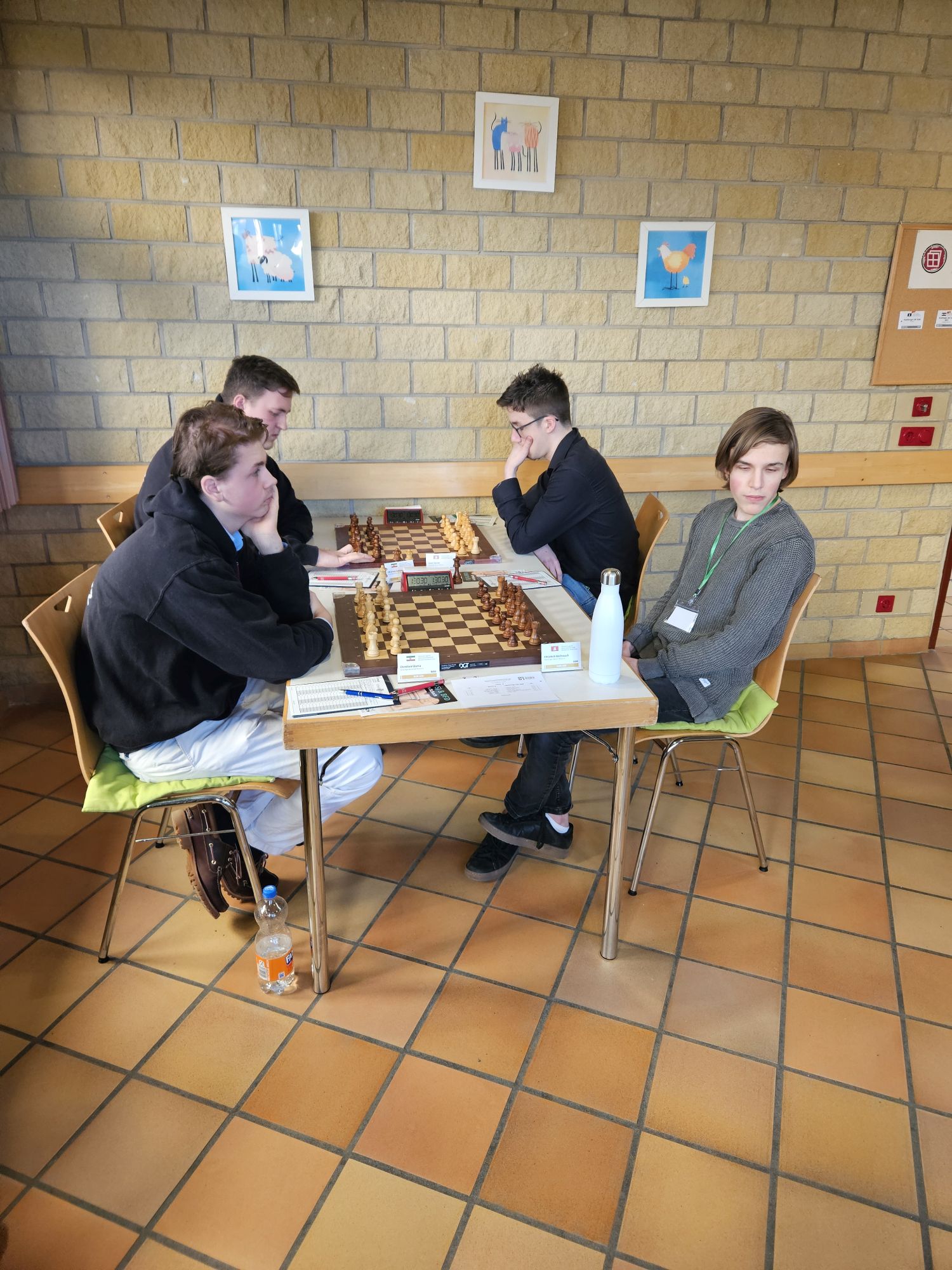 Unser Team war dabei nach dem altersbedingten Ausscheiden des „goldenen Jahrgangs“ 2003 gegenüber dem Vorjahr deutlich verändert – die Spitzenbretter besetzten FM Jonas Gallasch und Christian Gluma, die beim letztjährigen Titelgewinn auch schon dabei waren, außerdem blieb uns aus dem Vorjahresteam noch Rafael Sabirov erhalten, der das 4. Brett besetzte. Die freien Plätze in der Mannschaft besetzten Maximilian Menzel (Brett 3), der in den letzten zwei Jahren einen extremen Leistungssprung gezeigt hat, Victor Kruse (Brett 5), der vor Beginn der letzten Saison vom SK Köln-Südwest zu uns gewechselt ist, sowie Julian Kliffken (Brett 6), der uns zwar zum Beginn dieser Saison Richtung Eschweiler verlassen hat, aber für die DVM 2024 noch für uns spielberechtigt war. Auch Julian, der 2023 in unserem U16-Team das vierte Brett besetzt hat, hat in den vergangenen 12 Monaten einen mächtigen Leistungssprung gezeigt und seine DWZ von rund 1500 auf knapp 2000 geschraubt. Als Trainer konnten wir unser letztjähriges Spitzenbrett der U20-Mannschaft und Zweitligaspieler FM Alexander Suvorov gewinnen und auch Thomas Gluma war als Organisator und Mädchen für alles wieder dabei.