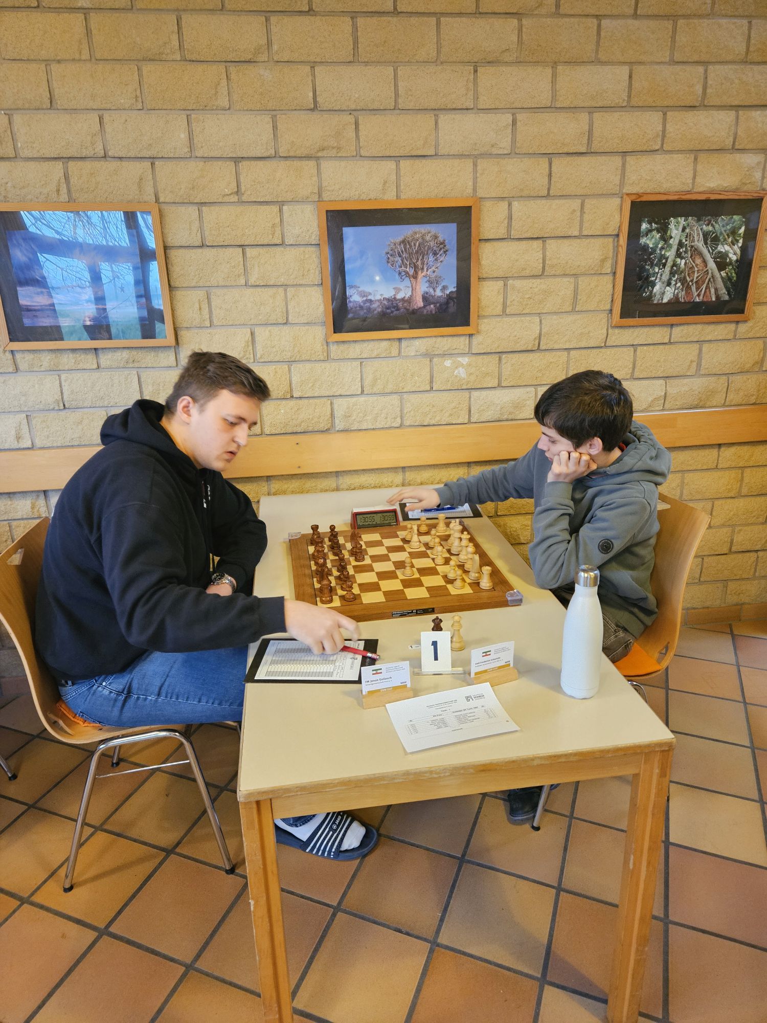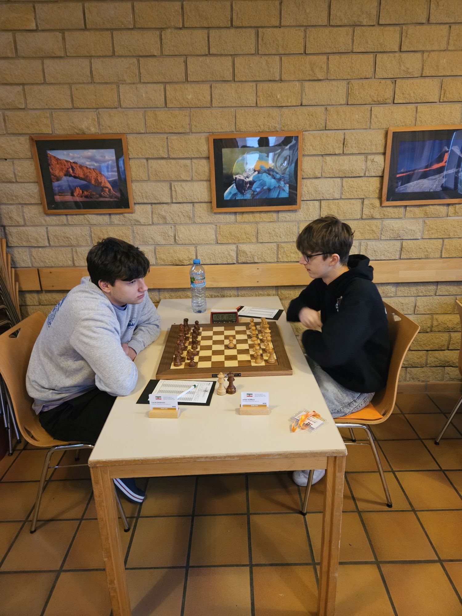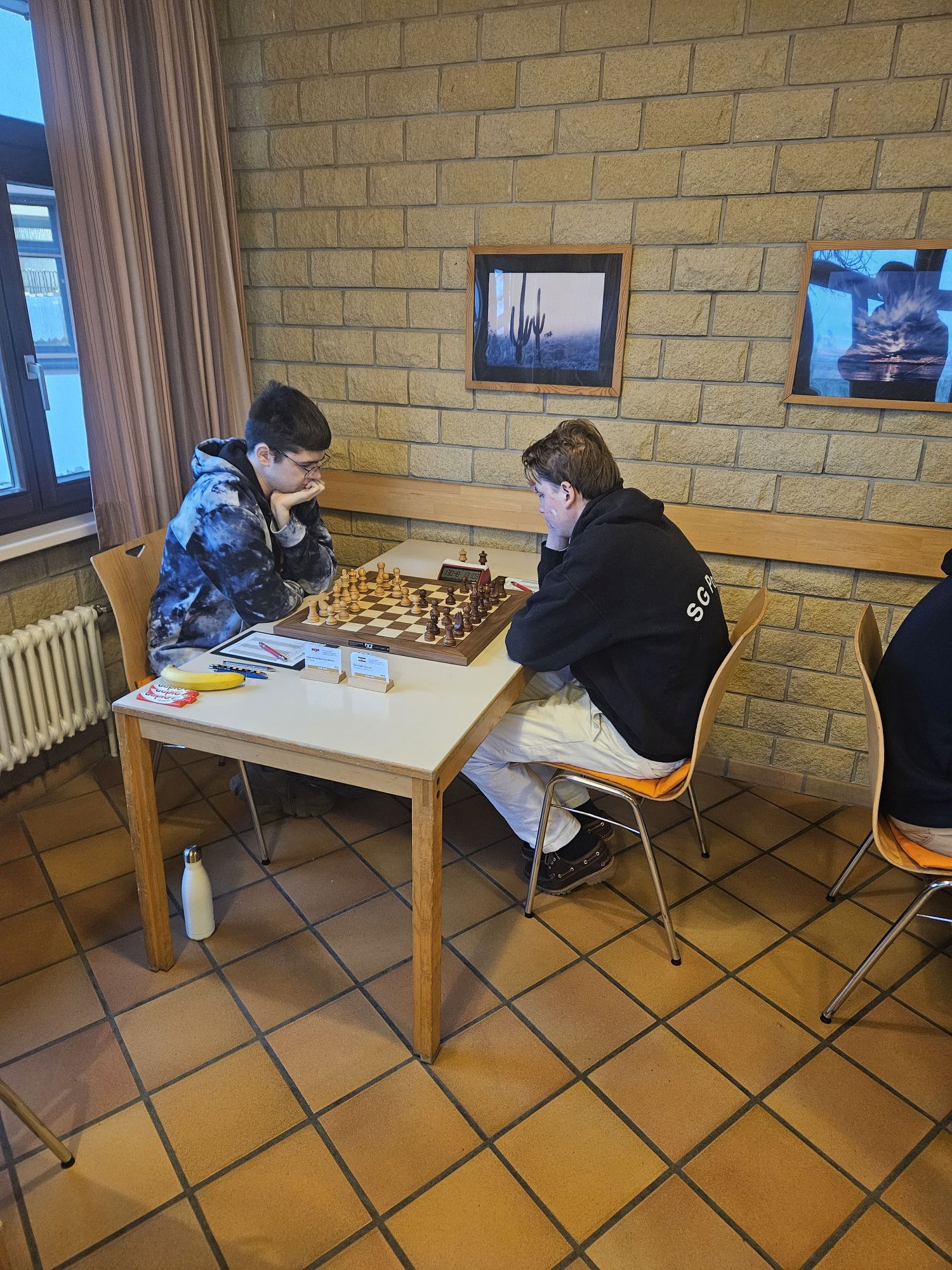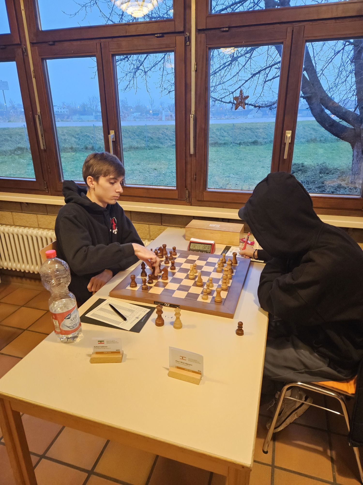 Unser Team war dabei nach dem altersbedingten Ausscheiden des „goldenen Jahrgangs“ 2003 gegenüber dem Vorjahr deutlich verändert – die Spitzenbretter besetzten FM Jonas Gallasch und Christian Gluma, die beim letztjährigen Titelgewinn auch schon dabei waren, außerdem blieb uns aus dem Vorjahresteam noch Rafael Sabirov erhalten, der das 4. Brett besetzte. Die freien Plätze in der Mannschaft besetzten Maximilian Menzel (Brett 3), der in den letzten zwei Jahren einen extremen Leistungssprung gezeigt hat, Victor Kruse (Brett 5), der vor Beginn der letzten Saison vom SK Köln-Südwest zu uns gewechselt ist, sowie Julian Kliffken (Brett 6), der uns zwar zum Beginn dieser Saison Richtung Eschweiler verlassen hat, aber für die DVM 2024 noch für uns spielberechtigt war. Auch Julian, der 2023 in unserem U16-Team das vierte Brett besetzt hat, hat in den vergangenen 12 Monaten einen mächtigen Leistungssprung gezeigt und seine DWZ von rund 1500 auf knapp 2000 geschraubt. Als Trainer konnten wir unser letztjähriges Spitzenbrett der U20-Mannschaft und Zweitligaspieler FM Alexander Suvorov gewinnen und auch Thomas Gluma war als Organisator und Mädchen für alles wieder dabei.