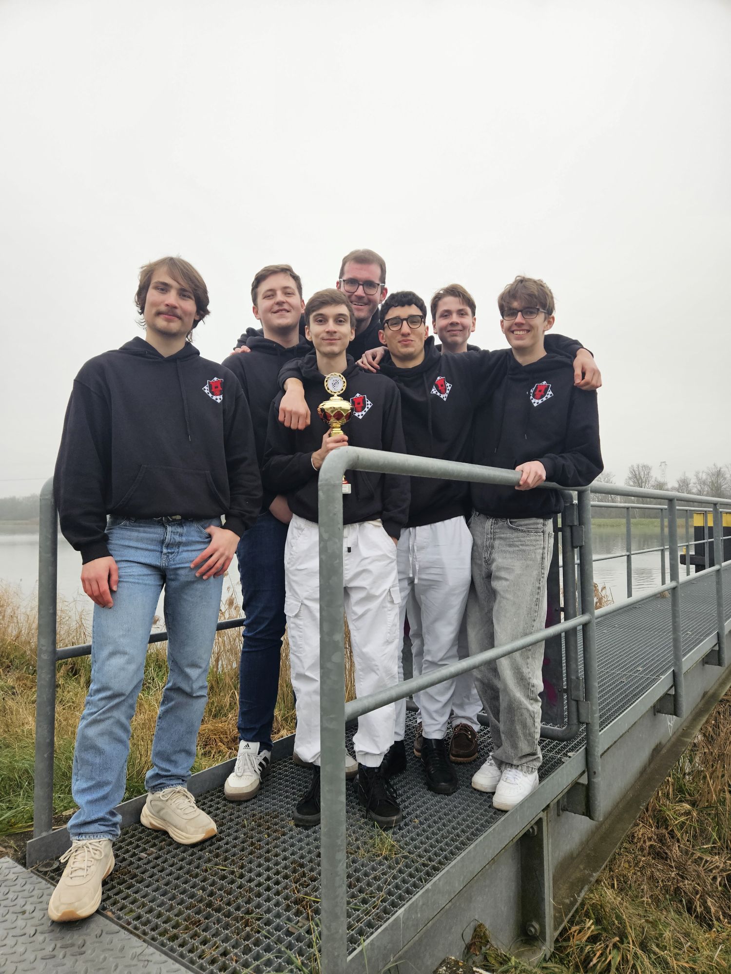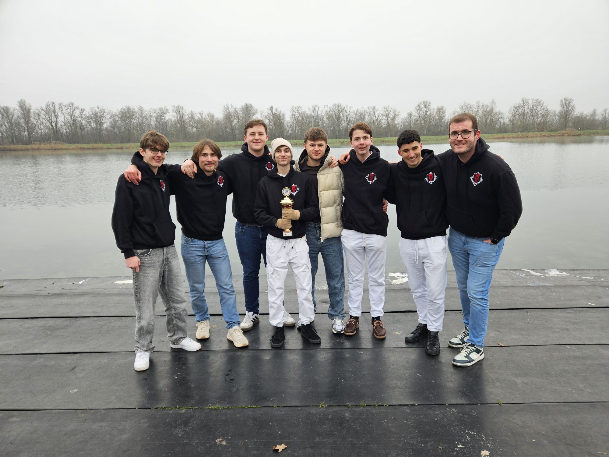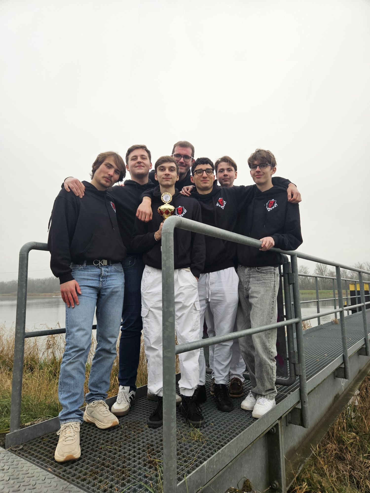 Die Anreise unserer neunköpfigen Delegation am zweiten Weihnachtstag gestaltete sich holprig, da wir aufgrund eines Personenschadens einen unfreiwilligen zweistündigen Zwischenstopp in Offenburg einlegen mussten. Dadurch verpassten wir das Abendessen in der Jugendherberge und erreichten nach einem Zwischenstopp beim Restaurant mit dem großen goldenen M erst gegen 21:45 Uhr unser Ziel in Breisach. Die idyllisch direkt am Rhein und der Grenze zu Frankreich gelegene Jugendherberge begrüßte uns mit dichtem Nebel und Temperaturen unter dem Gefrierpunkt, was sich leider über den gesamten Turnierverlauf weitgehend durchzog – es war eisig kalt und die Sonne kam nur selten durch die trübe Nebelsuppe durch.