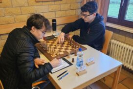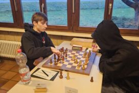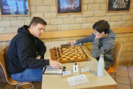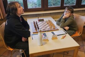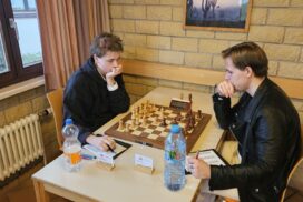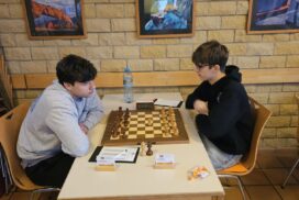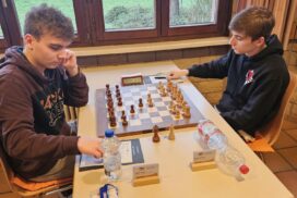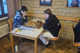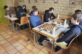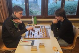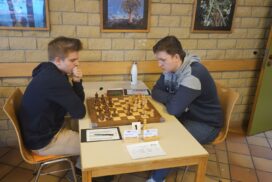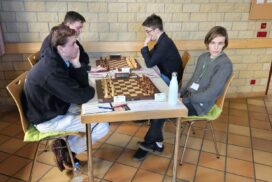 Das Favoritenfeld hatte sich damit weiter gelichtet, sodass andere Vereine aus dem Mittelfeld in die Spitzenpaarungen hochgespült wurden. Neuberg spielte gegen Mitfavorit Krefeld (die zuvor in Runde 3 den HSK unterlegen waren) und wir bekamen den Ausrichter aus Freiburg-Zähringen zugelost, die nach einer Auftaktniederlage gegen den HSK alle drei Kämpfe gegen teils höher eingeschätzte Teams siegreich gestalten konnten. Nominell ein machbares Los, aber gerade diese Teams, noch zusätzlich mit der Sondermotivation als Ausrichter können unangenehme Herausforderungen werden. Freiburg zählte an diesem Tag jedoch nicht zu dieser Kategorie. Julian gewinnt wieder „nach Belieben“ und hat nach seiner rund zweistündigen Partie mehr Bedenkzeit auf der Uhr, als am Anfang der Partie und setzt sich auf fantastische 5/5! Das gibt dem Team von Runde zu Runde mehr Sicherheit. Insgesamt wehrt sich Freiburg nach Kräften, ist insgesamt jedoch ziemlich chancenlos und wir gewinnen mit 5,5:0,5 (Christian remisiert) erneut hoch, was für unsere Feinwertung bei Punktgleichheit Gold wert ist. Unsere Hoffnung, Neuberg noch abzufangen, fußte im Wesentlichen darauf, dass Neuberg noch gegen den HSK spielen werden müsse – doch dann kam die Schützenhilfe schon eher aus NRW – Krefeld spielt seinen vermutlich besten Mannschaftskampf der DVM und schlägt Neuberg ungefährdet mit 3.5-2.5, befördert uns damit zurück an den Platz an der Sonne und ist selber voll im Titelrennen dabei!