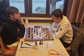 Auch in diesem Jahr bietet dieser Kampf wieder höchstes Drama und Emotionen, den ersten Punkt können wir jedoch setzen – Julian macht einfach da weiter, womit er in den drei Runden vorher angefangen hat – schnell spielen, minimale positionelle Vorteile kneten und den Gegner dann einfach überspielen. Sein Gegner ist rasch in Zeitnot und lässt sich dann mit überraschend wenig Widerstand von Julian überfahren – 1:0 für Porz. Die nächste Partie endet am dritten Brett. Max Gegner Faris Avdic – im letzten Jahr noch Hamburgs Mr. 100% mit 7/7 – überrascht damit, dass er auf Max Nimzoindisch-Avancen mit 3. Sf3 reagiert, was so in den Datenbanken von ihm noch nicht zu finden war. Max wechselt daher spontan zu Damenindisch und die Partie endet nach recht ereignisarmen 28 Zügen in einem Remisangebot von Avdic, welches Max angesichts unserer Führung akzeptiert. Leider ist jedoch absehbar, dass wir am Spitzenbrett den Ausgleich kassieren werden. Jonas spielt zum zweiten Mal binnen drei Wochen gegen Isaac Garner und sinnt auf Revanche für seine Niederlage in der 2. Bundesliga. Nach einem längeren theoretischen Scharmützel im Königsindisch reagiert Jonas auf einen Springerzug von Garner nicht optimal und sieht sich einem scharfen Königsangriff ausgesetzt, den er nur auf Kosten von zu großen positionellen Nachteilen abfedern kann. Auch die letzte Nebelkerze eines Qualitätsopfers im Breisacher Frost verpufft und es bleibt Jonas nur die Aufgabe der Partie. Beim Stand von 1.5-1.5 überschlagen sich in Zeitnot die Ereignisse.