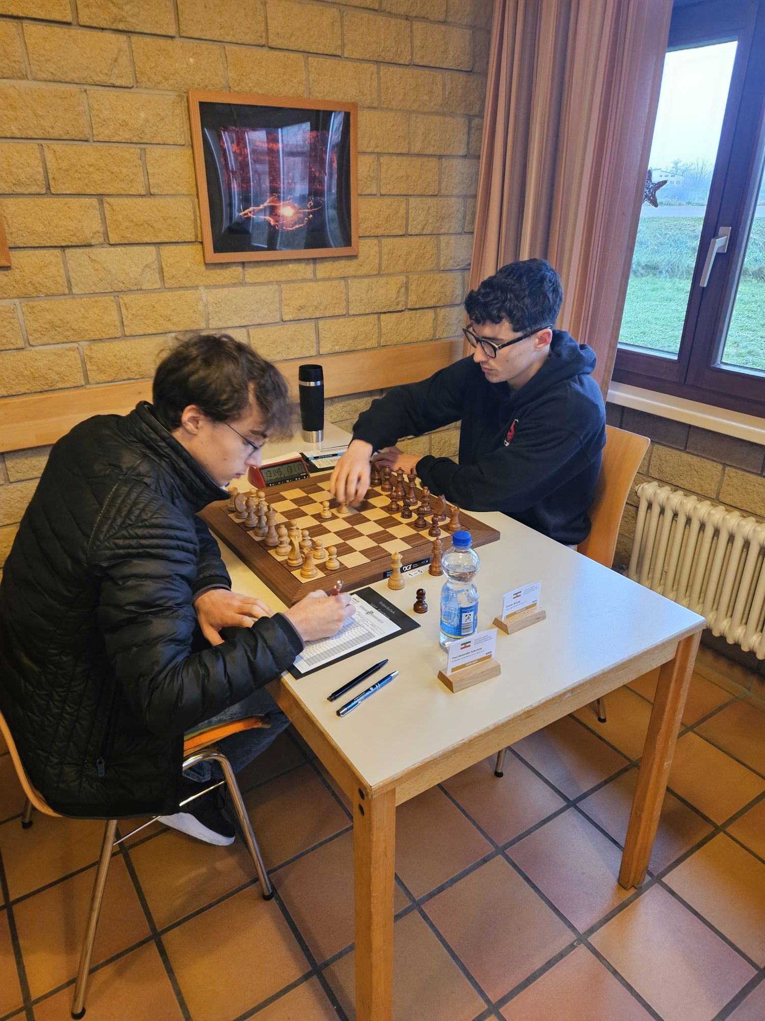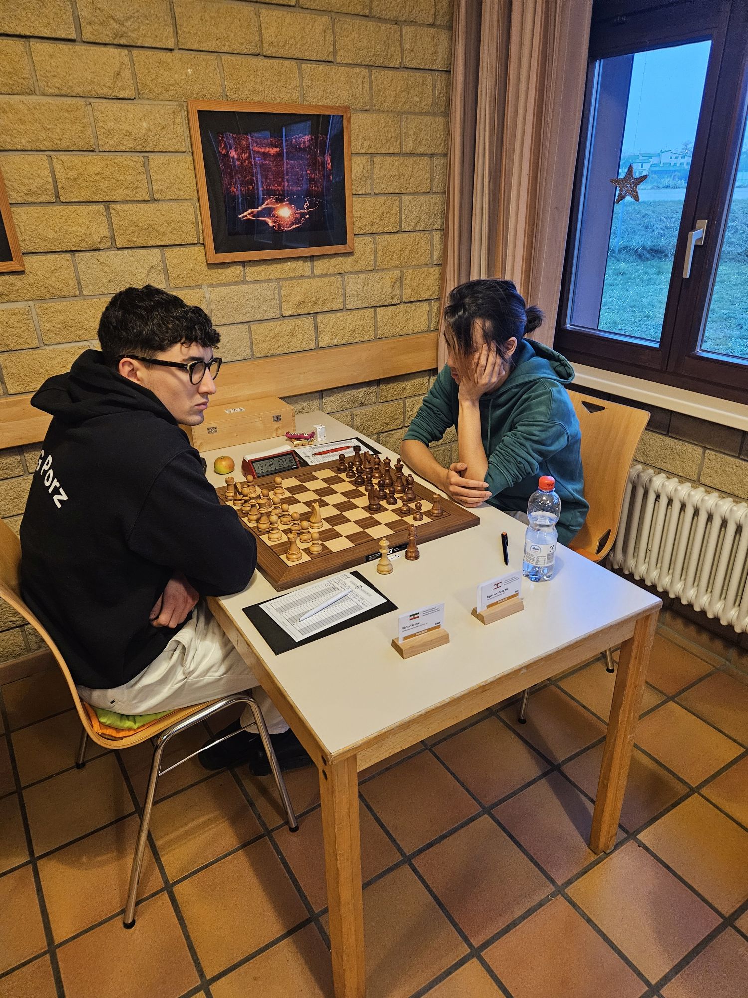 Victor hat im Mittelspiel eine Qualität erobert, dann jedoch im Bestreben, mit einem Damentausch die Stellung zugunsten seiner etwas luftigen Königsstellung zu vereinfachen, seinem Hamburger Gegner ermöglicht, ein mächtiges Läuferpaar und einen gedeckten Freibauern auf d6 zu installieren. Nur mit einer Reihe von Klimmzügen kann Victor mit seinen beiden Türmen gerade genug Gegenspiel installieren, um den weißen König beschäftigt zu halten, sodass der weiße Freibauer den Tag nicht entscheidet. Erst lange nach der Zeitkontrolle bietet sich eine Victor eine Gelegenheit, durch Rückopfer der Qualität in ein Endspiel mit Springer gegen Läufer abzuwickeln, welches aufgrund der reduzierten Bauernzahl und der Möglichkeit, den weißen Freibauern auf alle Ewigkeit mit dem König zu blockieren remis ist. Die Anspannung löst sich bei den Zuschauern daraufhin langsam, doch wenige Minuten später gehen Hamburger und Porzer Teammitglieder wieder in den Turniersaal und stellen mit Unglauben fest, dass auch die letzten Leichtfiguren abgetauscht worden sind. Das Bauernendspiel muss doch verloren sein, oder? Ja, es ist verloren, Achterbahnfahrt der Gefühle. Die Spieler ziehen einmal die Könige hin und her, dann zieht der Hamburger Spieler noch einmal zurück und bietet enttäuscht remis an. Victor nimmt an, ungläubige Erleichterung bei uns, Entsetzen bei den Hamburgern – Porz gewinnt 3,5:2,5 und ist damit erster Verfolger von Neuberg, die die TSG Oberschöneweide mit einer starken Vorstellung 5:1 besiegen.