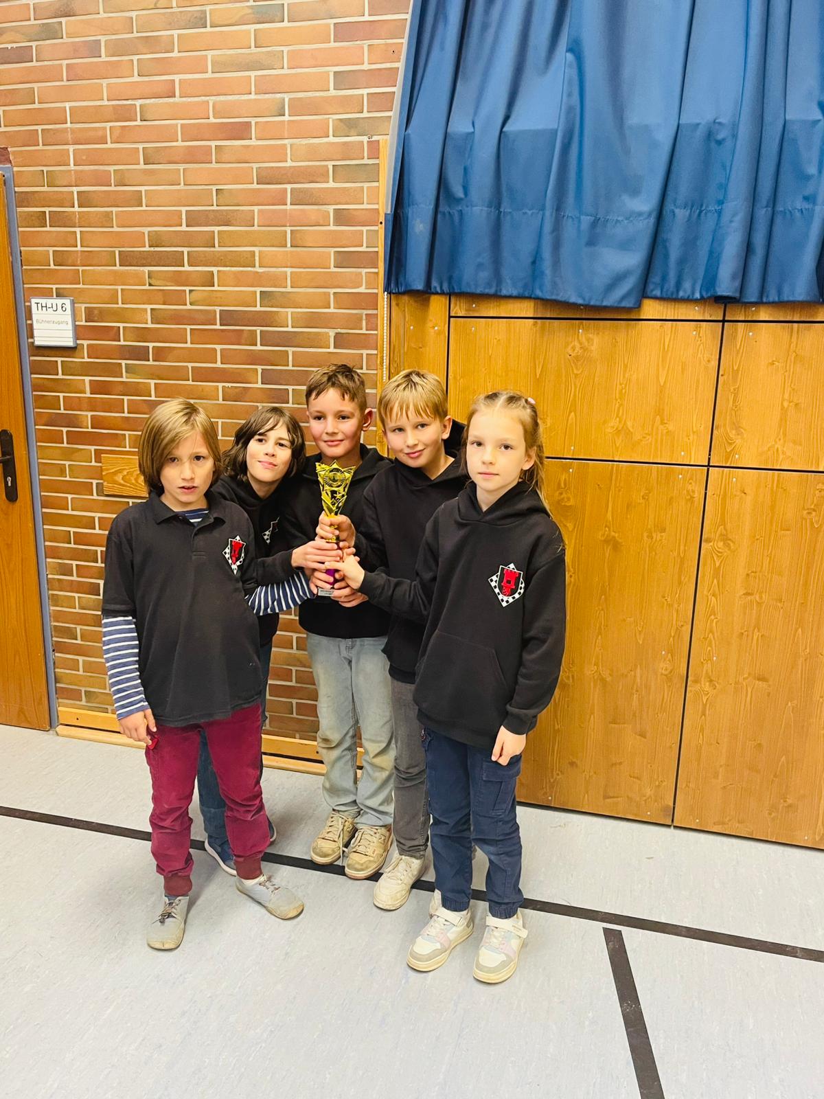 Nach einem ungefährdeten 4:0-Auftaktsieg gegen Schiefbahn trafen wir bereits auf Fritzdorf, die bei der SJM U10 Mannschaftsmeisterschaft in Brühl vor 3 Wochen noch vor uns lagen. Heute lief es für uns jedoch besser und unser Sieg fiel mit 4:0 überraschend hoch aus. In den beiden nächsten Runden folgten zwei knappe 2,5:1,5-Siege gegen den DSV und den DSK. Auch gegen Mülheim-Nord (4:0) und Erkenschwick (3,5:0,5) konnten wir Siege einfahren, bevor wir in der 7. Runde gegen Brackel antreten mussten. Hier mussten sich Jona und Daniel leider geschlagen geben (Jonas einzige Niederlage im Turnier!), aber Varvara und Thibaut konnten die Niederlage abwenden und sorgten somit für das 2:2. Es folgte ein erneut knapper 2,5:1,5-Sieg gegen Godesberg, bei dem Varvara beim Stand von 1,5:1,5 und mehreren Remisangeboten ihres Gegners ihre Nervenstärke unter Beweis stellen und den entscheidenden Sieg sichern konnte. Wir beendeten das Turnier gegen Essen-Werden mit einem 4:0-Sieg. Damit war die Titelverteidigung erfolgreich abgeschlossen!