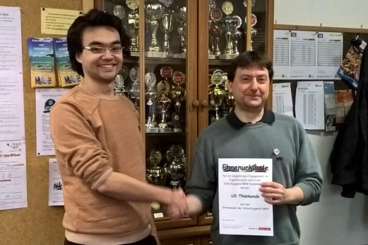 Überraschung für Uli Thiemonds! Am Freitag den 08. April 2016 erschien Thomas Kubo, der Vorsitzende Sport und Spielbetrieb der Schachjugend NRW, höchstpersönlich im Porzer Vereinslokal, um unserem Jugendwart Uli Thiemonds die Ehrennadel für langjähriges Engagement im Jugendschach zu verleihen. Wir gratulieren!