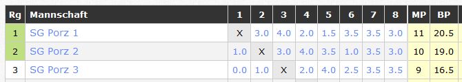 | 3 | SG Porz 2 | 0,5 | 2,0 | X | 2,0 | 2,5 | 3,0 | 1,5 | 3,5 | 8,0 | 15,0 |